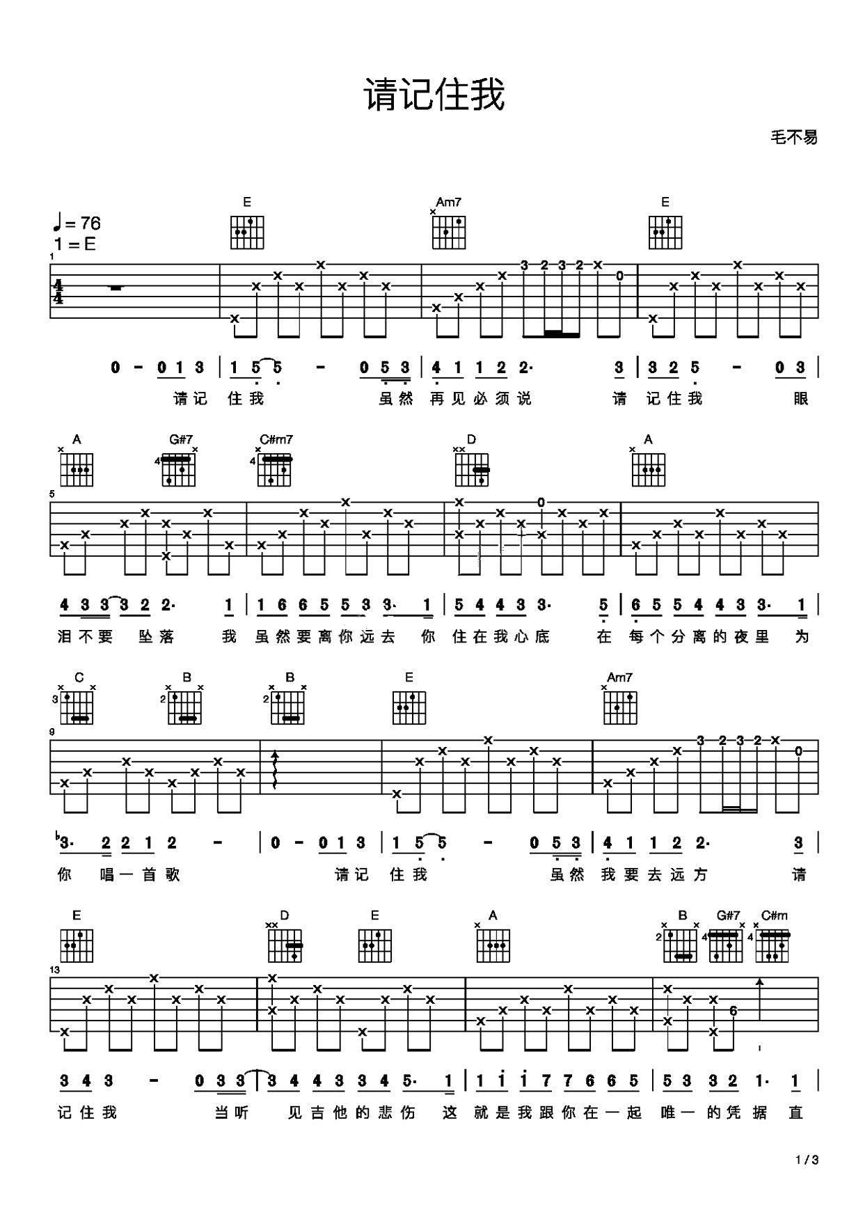 请记住我吉他谱,毛不易献唱电影《寻梦环游记》中文主题曲,这是一首唱离别的歌,动人的旋律真挚的歌词将影片爱和亲情的主题温情唱出。巨星毛不易独特的音色似乎带着特有的感动,让人第一句就忍不住沉浸其中。爱的对立面不是恨,生的对立面也不是死。世间最可怕的事情,就是被自己爱的人忘记。“在爱的...