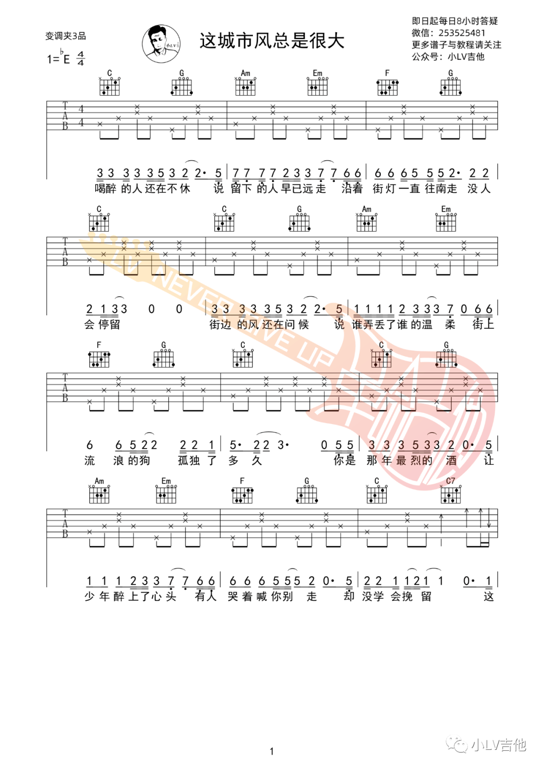 枯木逢春《这城市风总是很大》吉他谱,革命吉他编配出品,共有2张高清图谱,免翻页排版设计。...