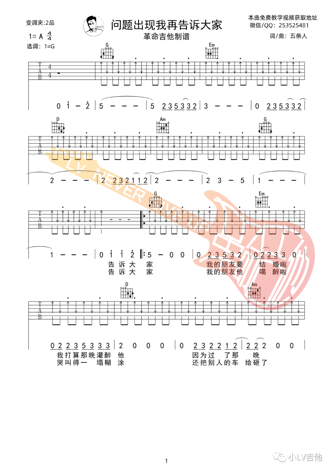 五条人《问题出现我再告诉大家》吉他谱,革命吉他编配出品,共有4张高清图谱。...