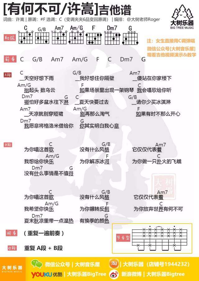 吉他许嵩《有何不可》吉他谱_吉他弹唱谱_大树音乐屋编配