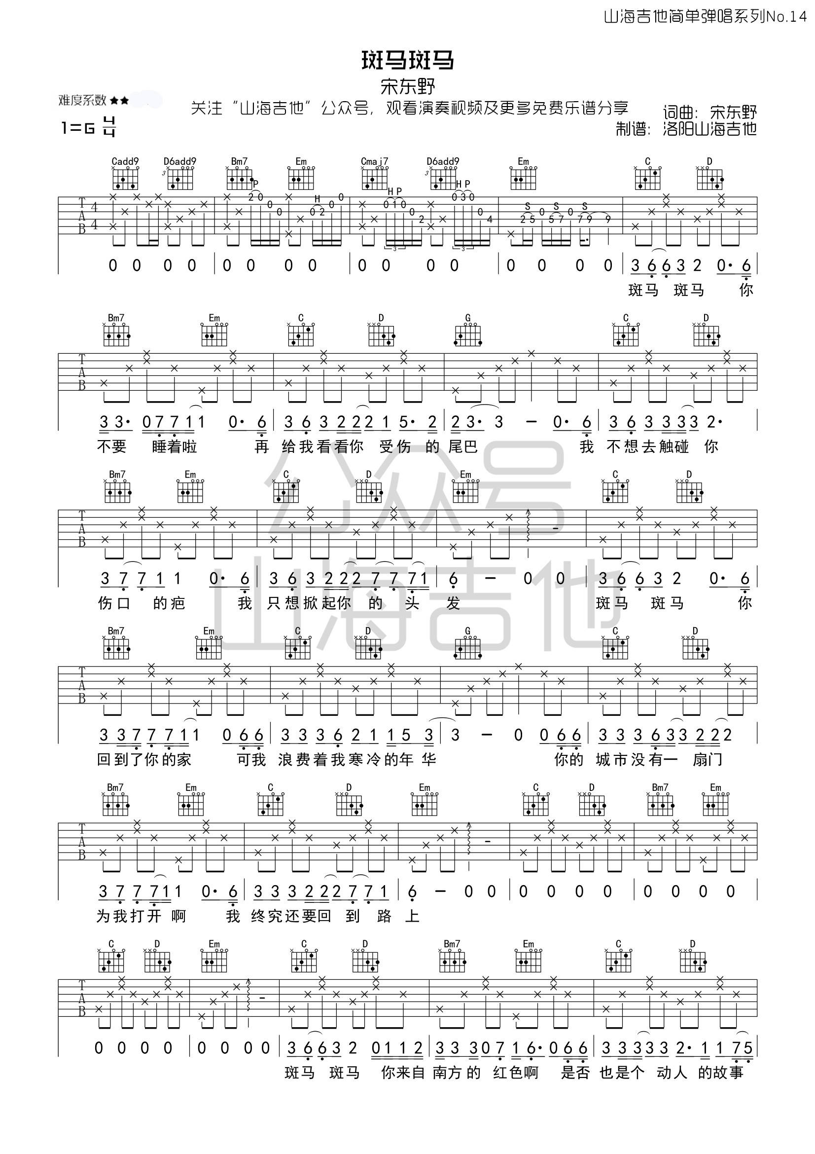 吉他宋冬野《斑马斑马》吉他谱_吉他弹唱谱_洛阳山海吉他编配