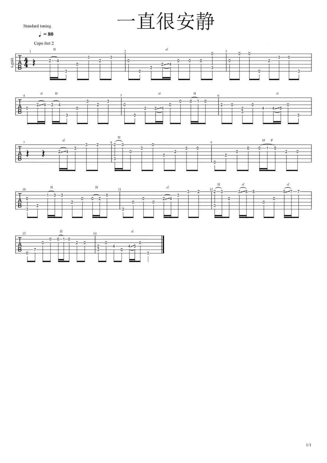吉他抖音《一直很安静》吉他谱_吉他指弹六线谱