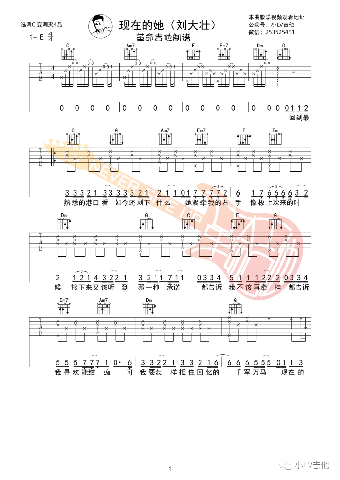 刘大壮《现在的她》吉他谱,革命吉他编配出品,共有3张高清图谱。...