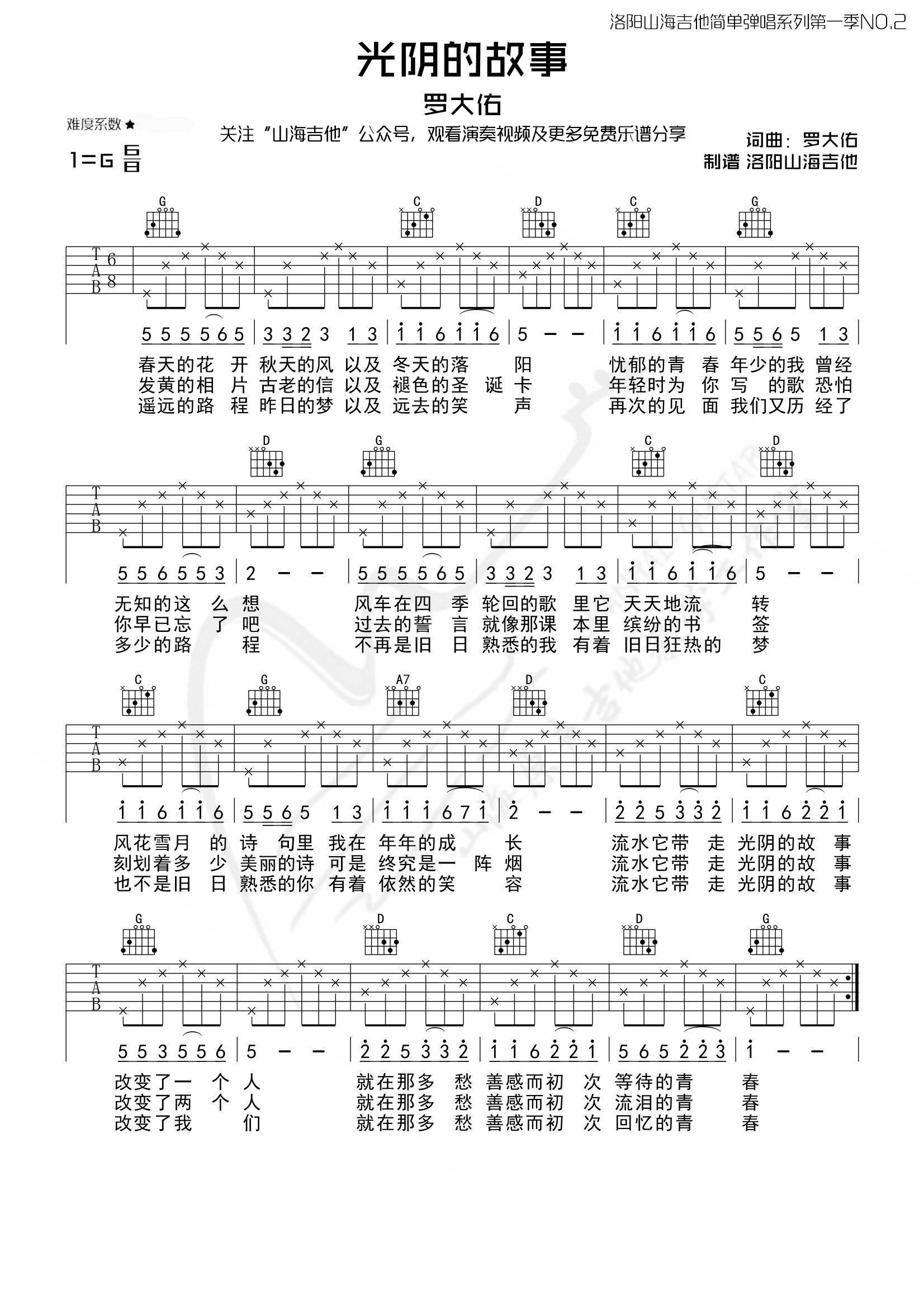 罗大佑《光阴的故事》吉他谱,山海吉他编配出品,共有1张高清图谱,免翻页排版设计。...