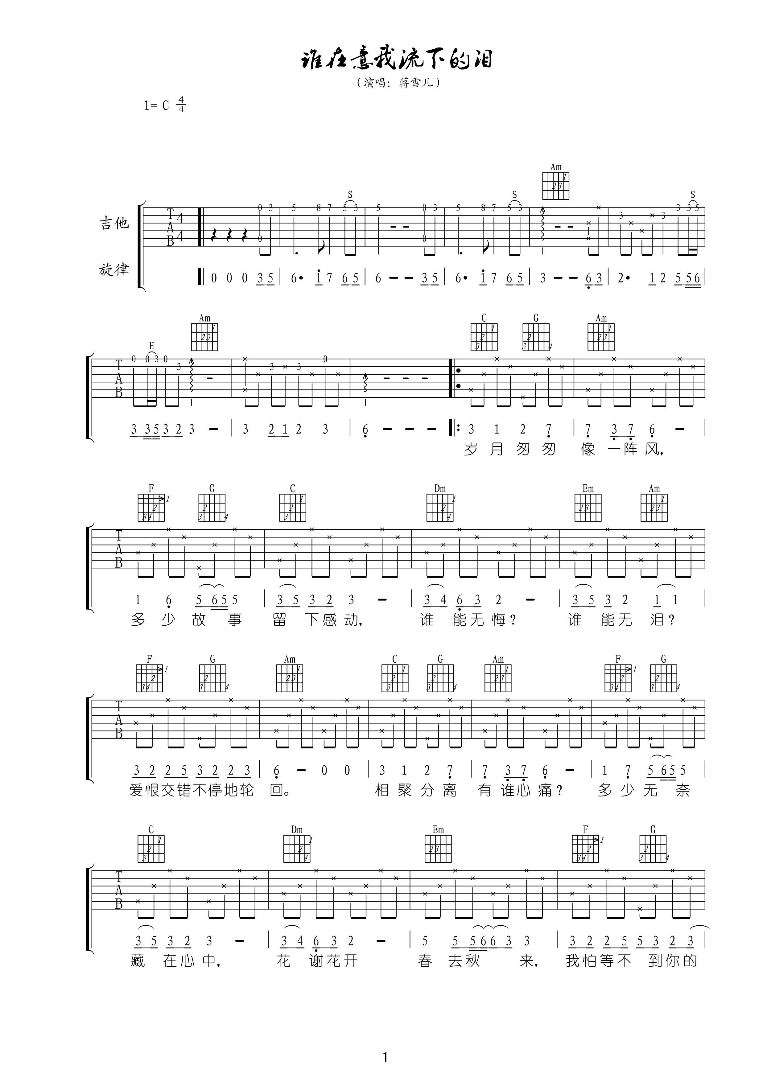 吉他蒋雪儿《谁在意我流下的泪》吉他谱_吉他弹唱谱