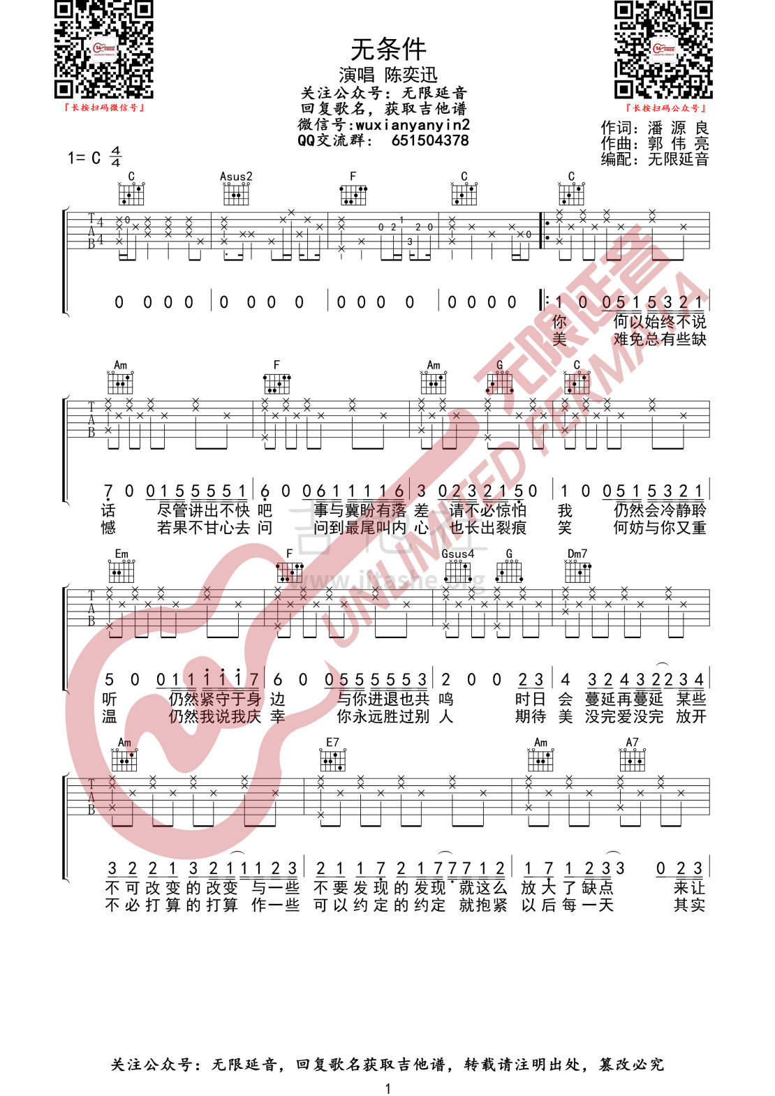 吉他陈奕迅《无条件》吉他谱_吉他弹唱谱_无限延音编配