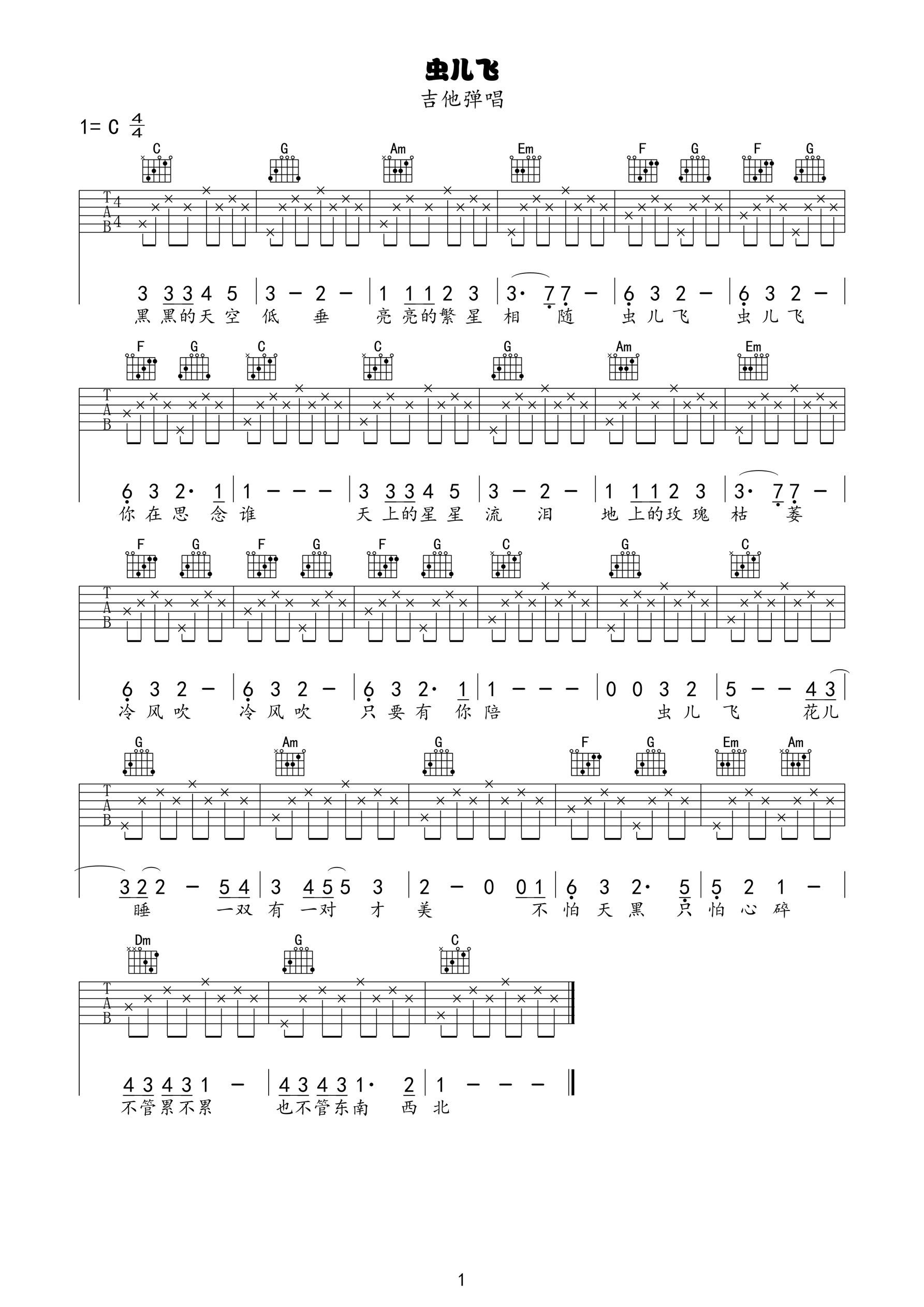 《虫儿飞》是1998年电影《风云雄霸天下》插曲,由陈光荣作曲、林夕作词的插曲,是《一对对》的国语版本。由香港歌手郑伊健演唱。因歌曲悠扬的旋律又类似于童谣的风格和配上浪漫的歌词广受大众喜欢,后出现很多翻唱版本,至于歌词,还不是很一致,这首编配的非常的简单非常的适合初学者练习弹唱。...