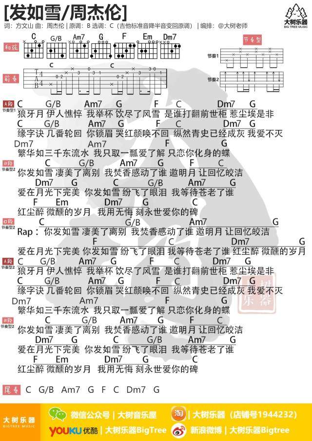 吉他周杰伦《发如雪》吉他谱_吉他弹唱谱_大树音乐屋编配