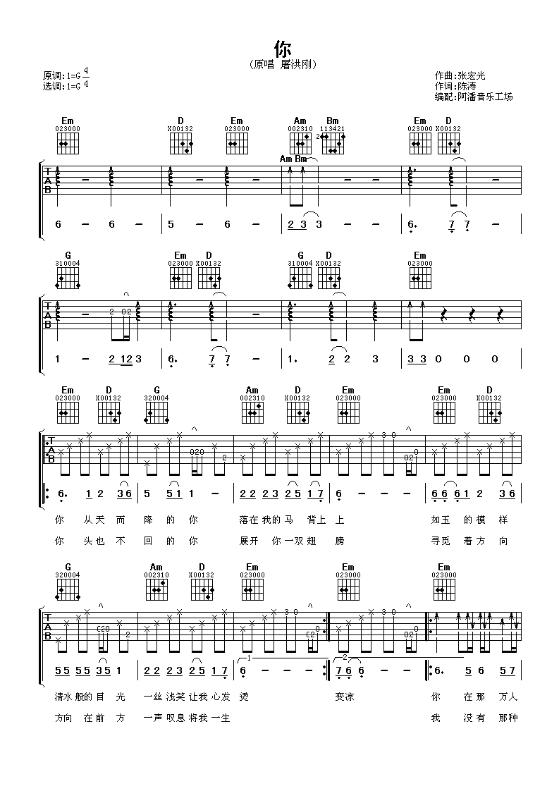 屠洪刚《你》吉他谱,共有2张高清图谱,免翻页排版设计。...