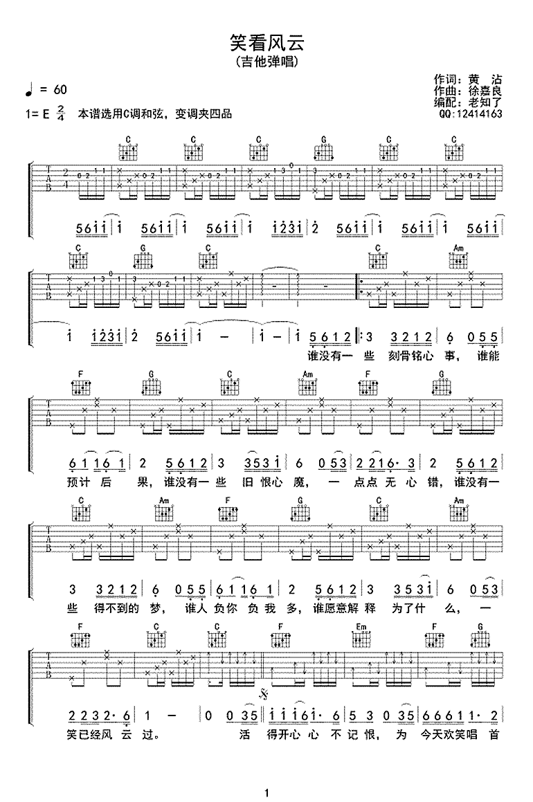 郑少秋《笑看风云》吉他谱,一首经典的粤语歌曲,《笑看风云》无线电视剧主题曲,原调E,本谱选用C调和弦,变调夹夹四品。风流倜傥的秋倌,从青春年少,到年至古稀,一直这么潇洒帅气,这一曲经典让人泪目,唯愿待到千帆过尽处,会是笑看风云时……...