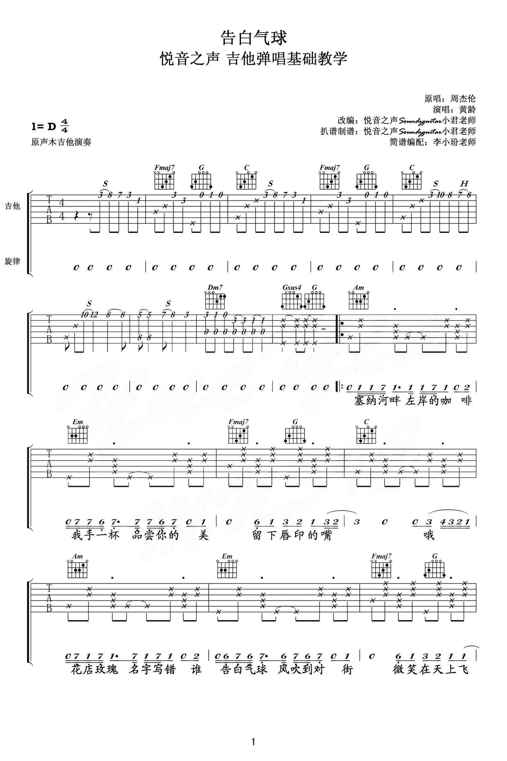 吉他周杰伦《告白气球》吉他谱_吉他弹唱谱_悦音之声编配