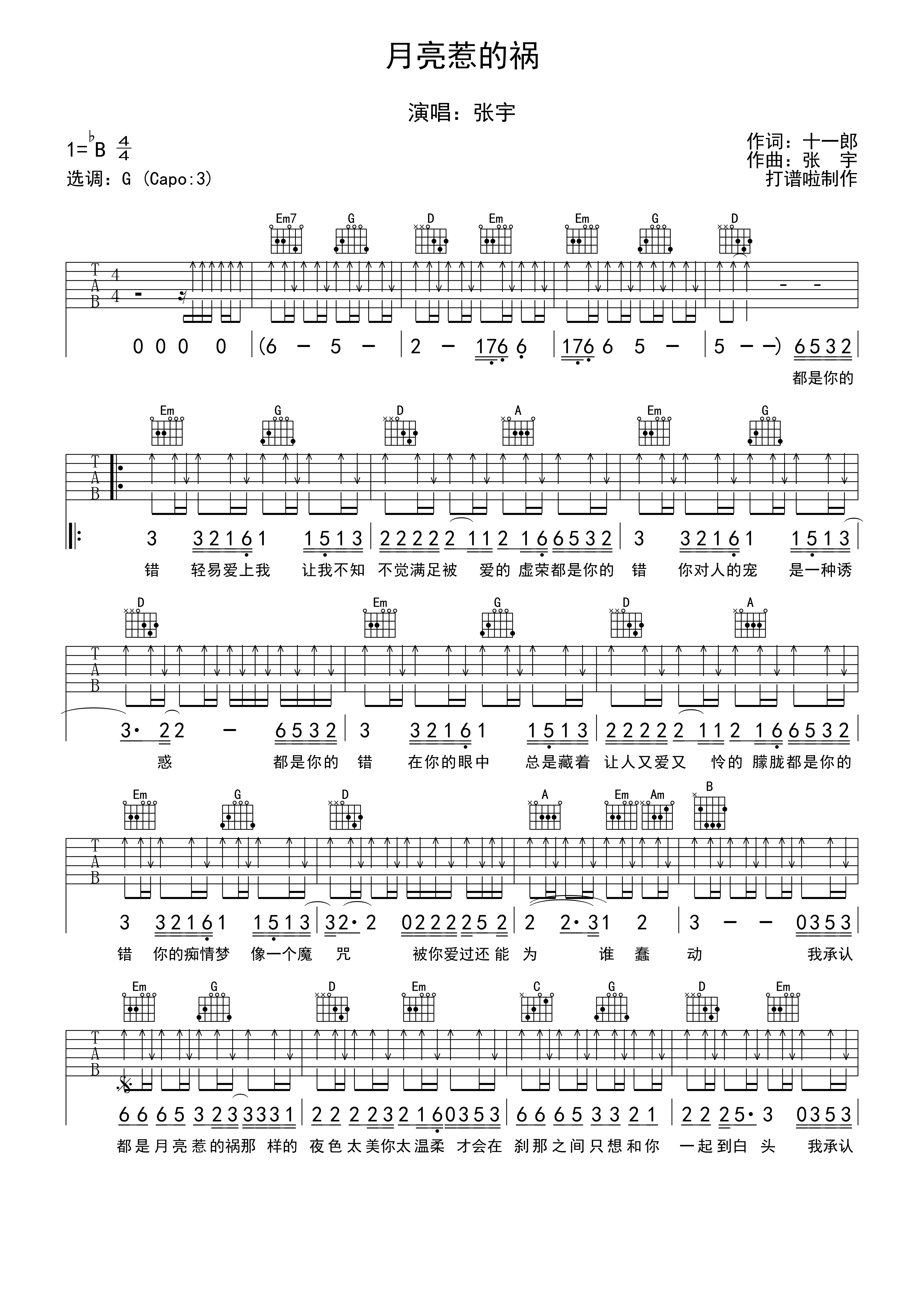 吉他张宇《月亮惹的祸》吉他谱_吉他弹唱谱