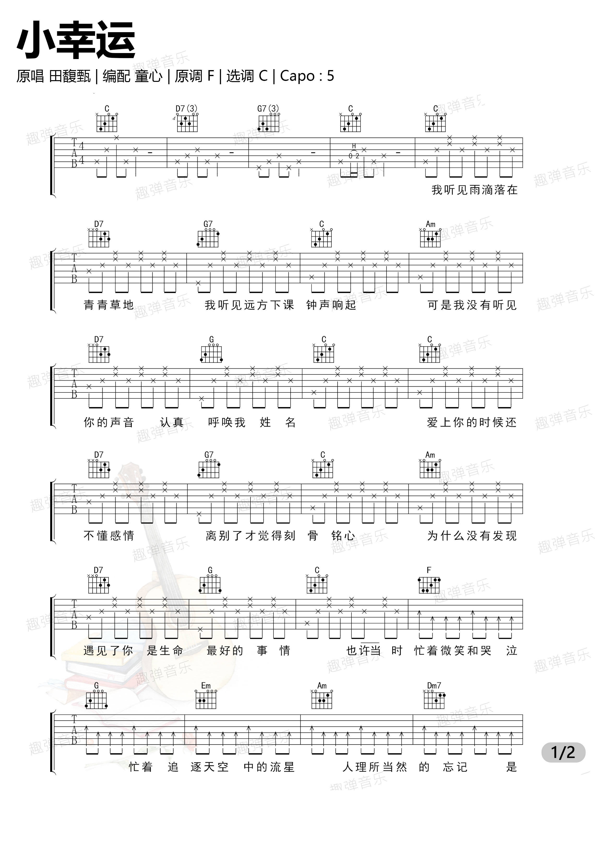 田馥甄《小幸运》吉他谱,趣弹音乐编配出品,共有2张高清图谱,免翻页排版设计。...