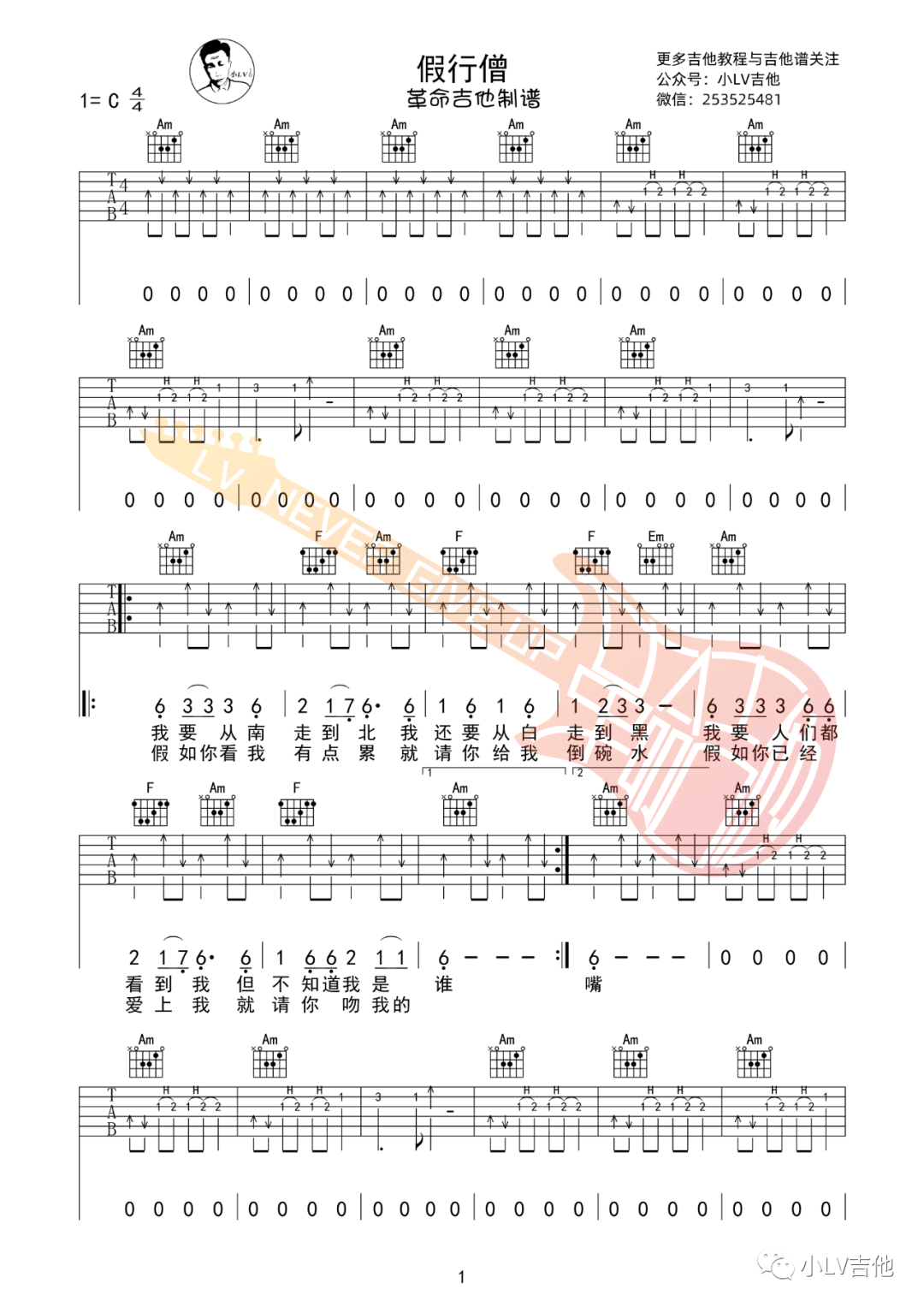 崔健《假行僧》吉他谱,革命吉他编配出品,共有3张高清图谱。...
