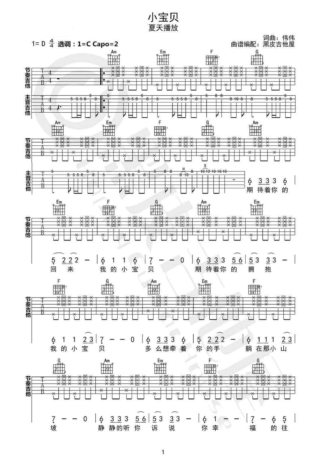 夏天播放《小宝贝》吉他谱,黑皮吉他屋编配出品,共有3张高清图谱。...