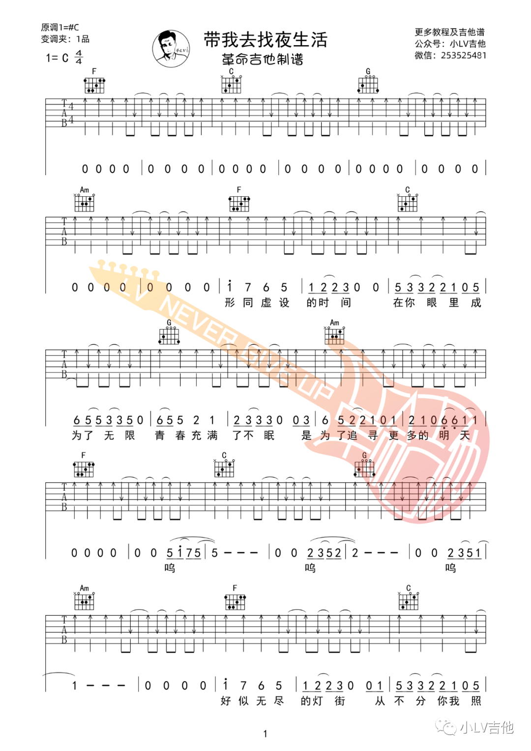 告五人《带我去找夜生活》吉他谱,革命吉他编配出品,共有5张高清图谱。...