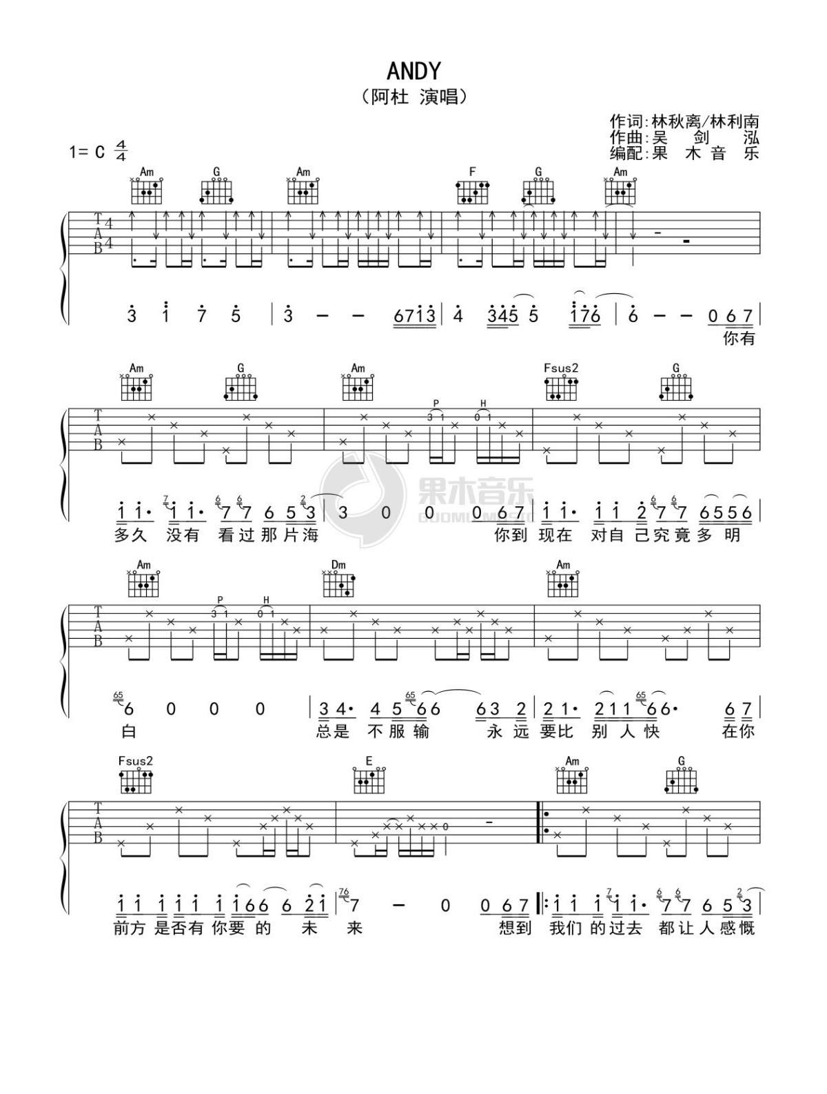 吉他阿杜《Andy》吉他谱_吉他弹唱谱_果木音乐编配