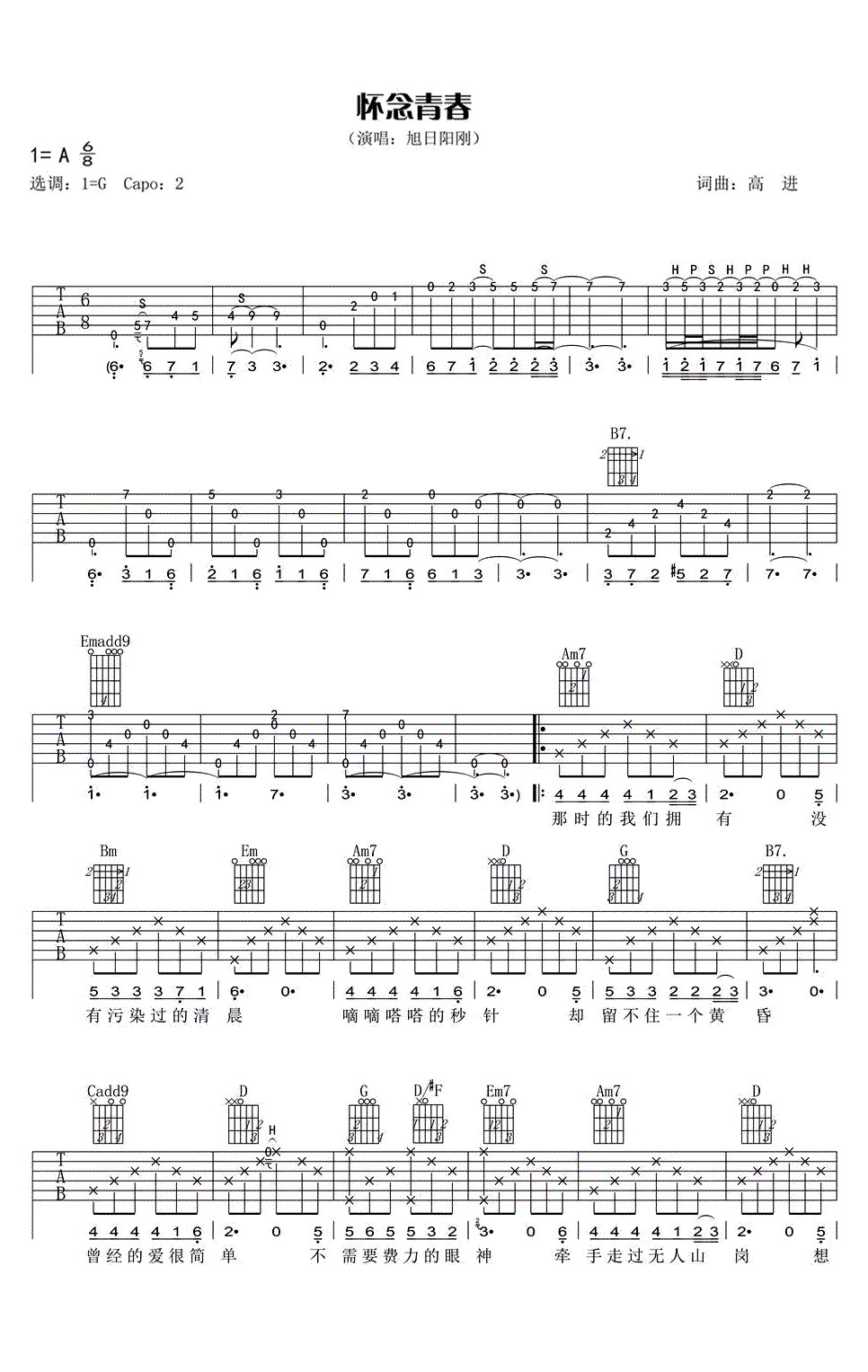 旭日阳刚《怀念青春》吉他谱,G调弹唱谱,变调夹夹第二品,。刘刚(旭日阳刚)的歌声朴实无华,感动了无数的听众,一首回首青春的歌曲中,感悟我们得到,我们失去和我们成长。回首看看走过的路程,那些理想和誓言都遗落在了青春的路上,脚印被尘埃掩盖、岁月沧桑…...