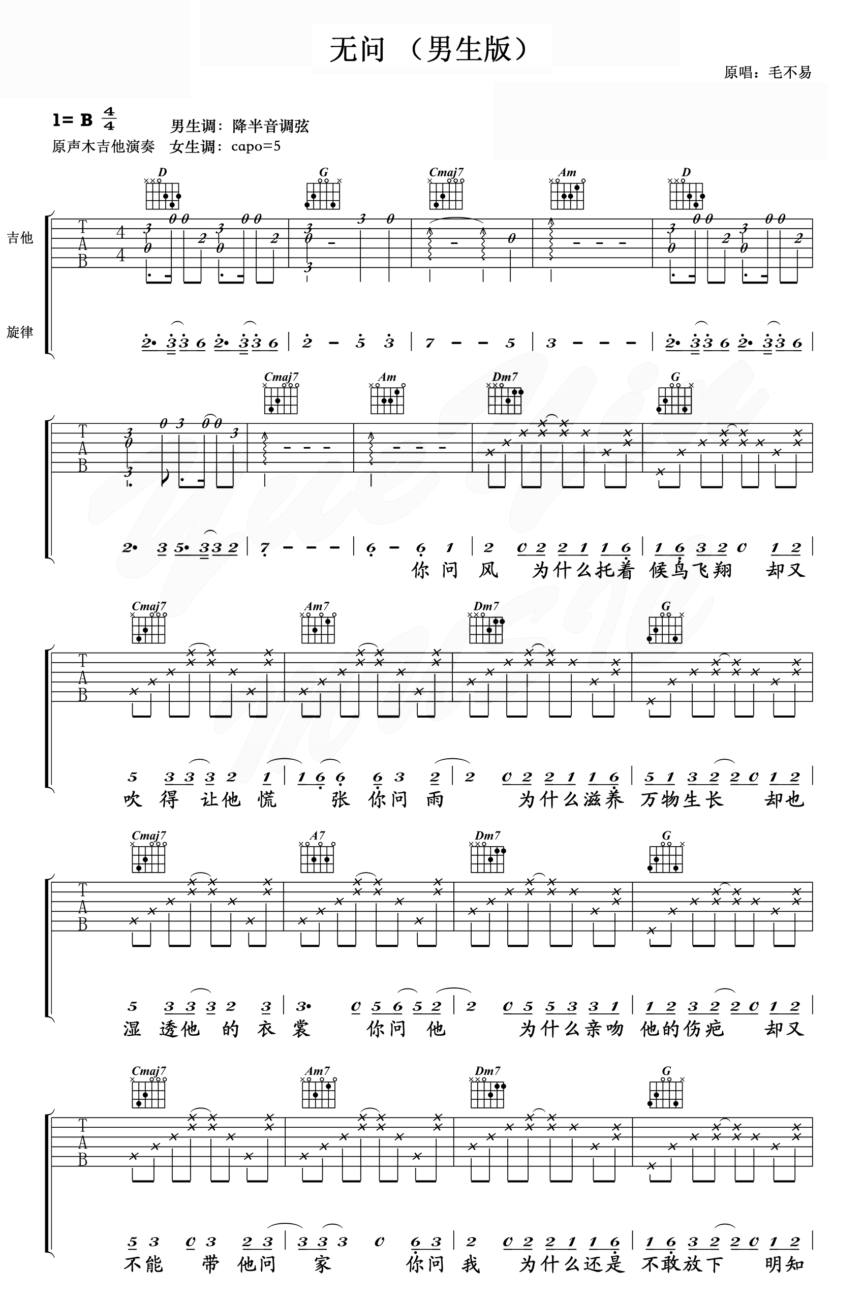 吉他毛不易《无问》吉他谱_吉他弹唱谱_悦音之声编配