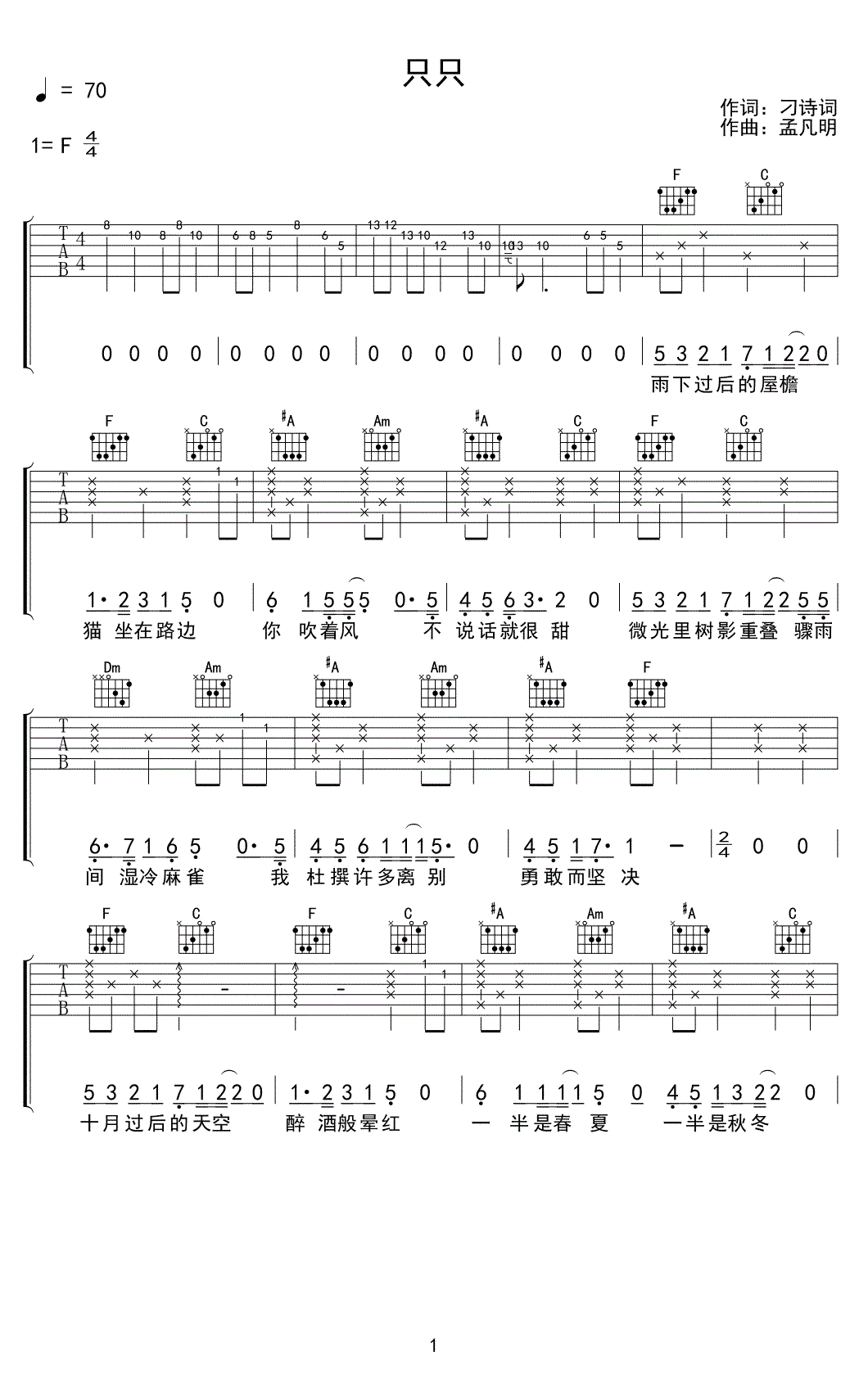 孟凡明《只只》吉他谱,F调,高清弹唱谱,一首好听的原创民谣歌曲。清新的旋律,温柔的歌声,生活中有许多东西都没有留下痕迹,或许这才是它们曾出现过的意义。这首《只只》是内心的柔软,也是心灵的慰籍。...