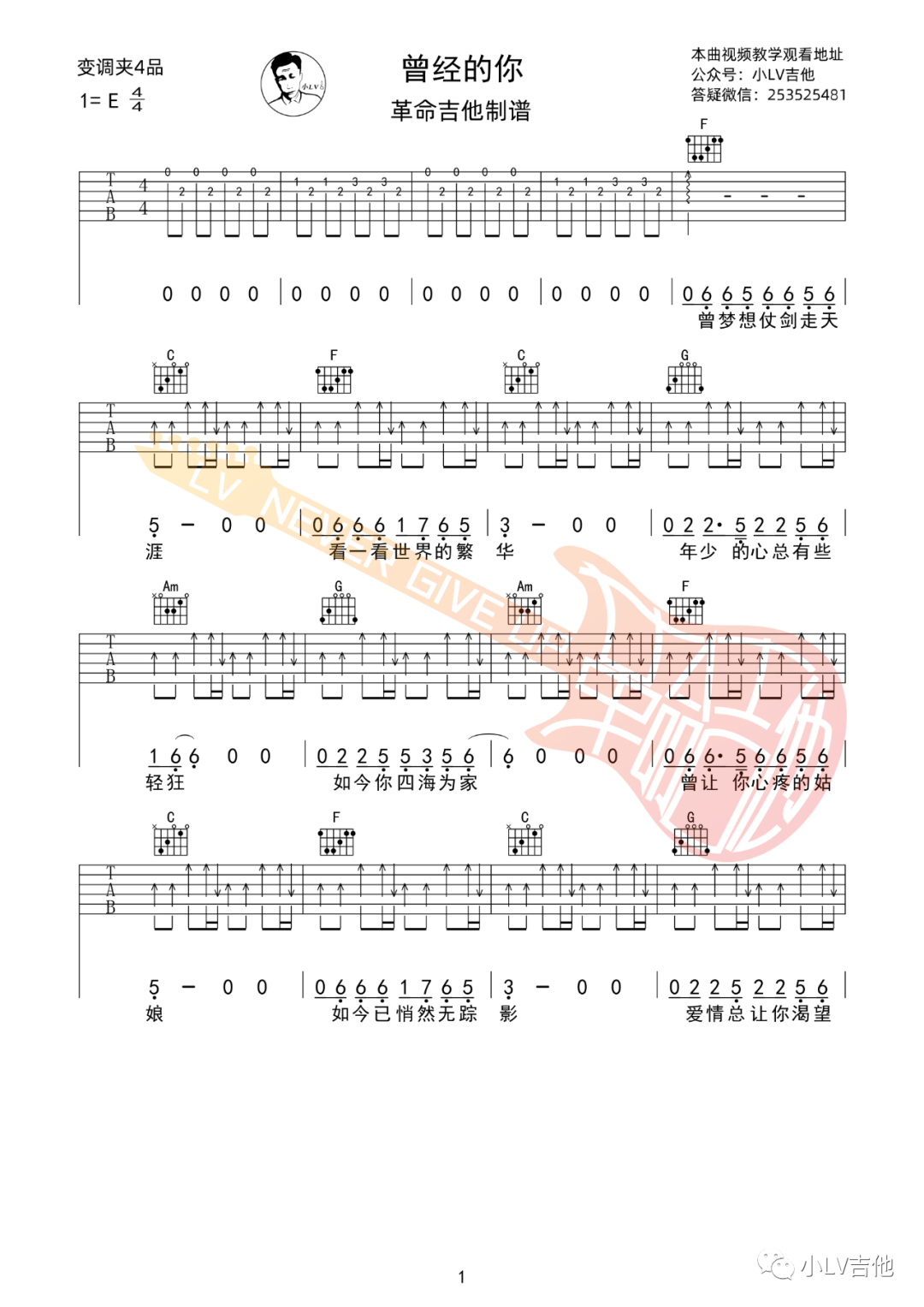 许巍《曾经的你》吉他谱,革命吉他编配出品,共有4张高清图谱。...