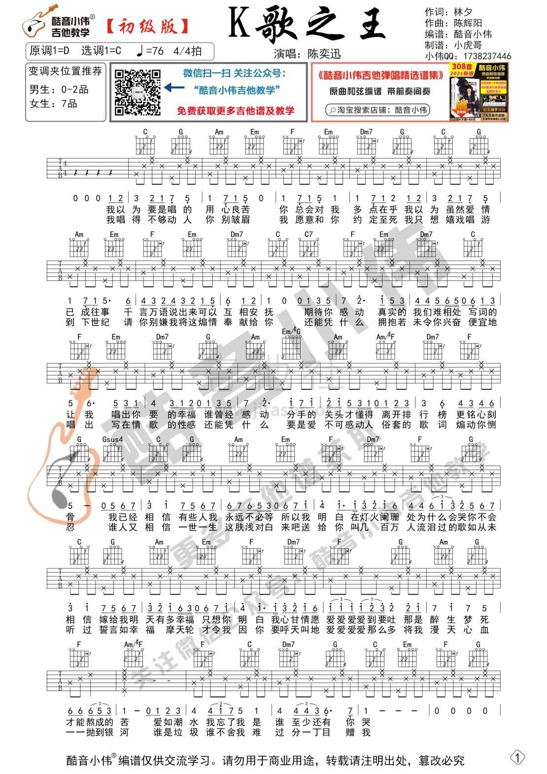 吉他陈奕迅《K歌之王》吉他谱_吉他弹唱谱_酷音小伟编配