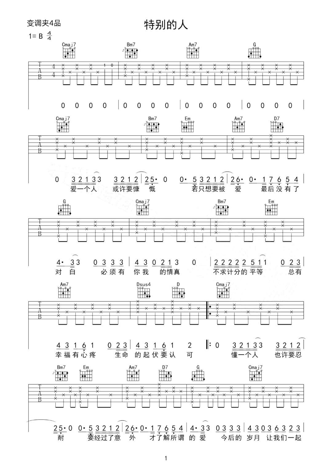 方大同《特别的人》吉他谱,革命吉他编配出品,共有3张高清图谱。...