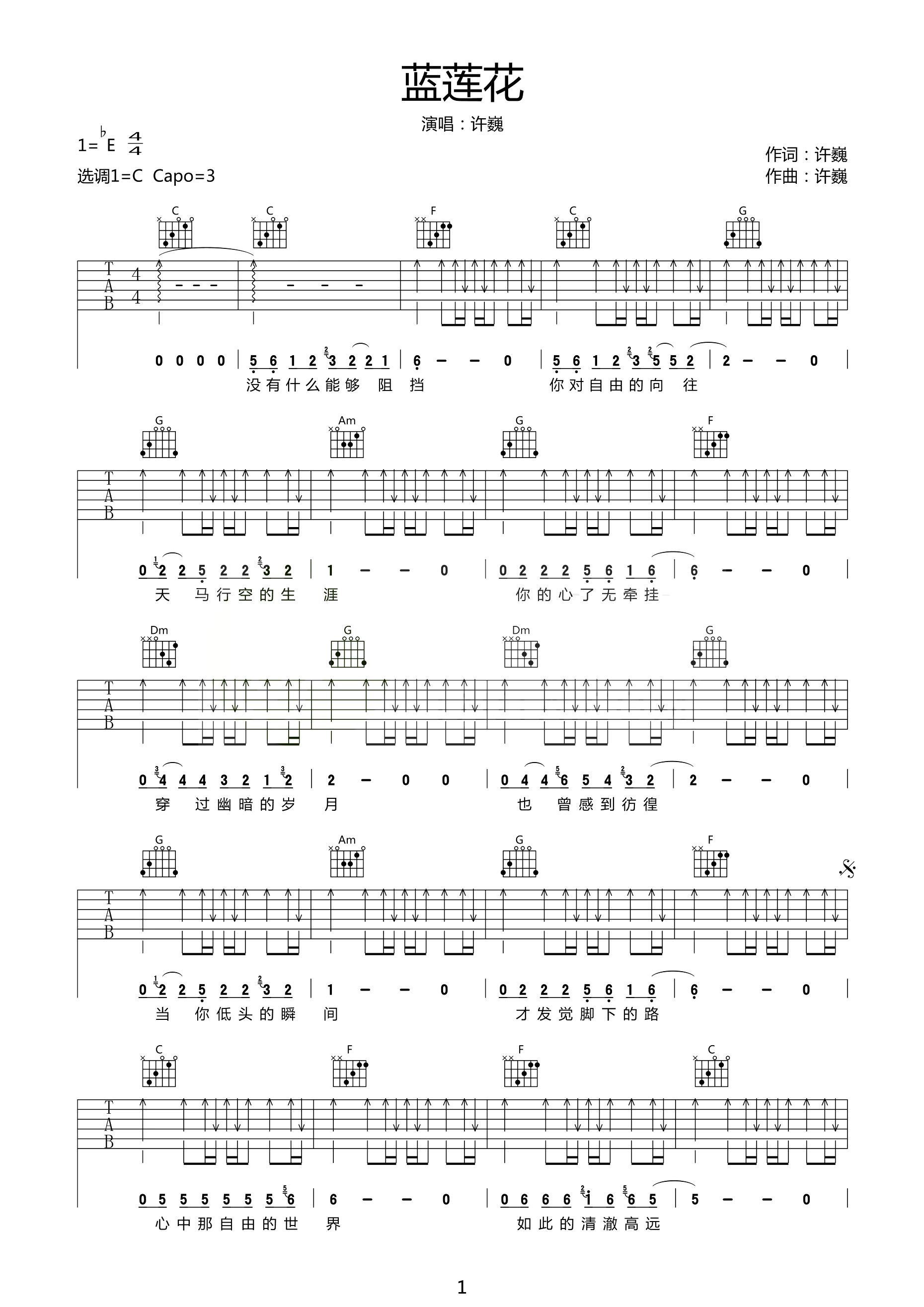 原调降E调,选调C调,CAPO夹三品。许巍的一首代表音乐作品《蓝莲花》吉他弹唱谱,曲谱为图片谱高清版。传说蓝莲花生长在寒冷的峭壁上,她象征着冰清玉洁,自由脱俗!这是许巍在走出重度抑郁症期间创作的这首经典,歌曲没有豪言壮语,只是用一种平静祥和的口吻唱出道路的坚定,唱出理想的美好。...
