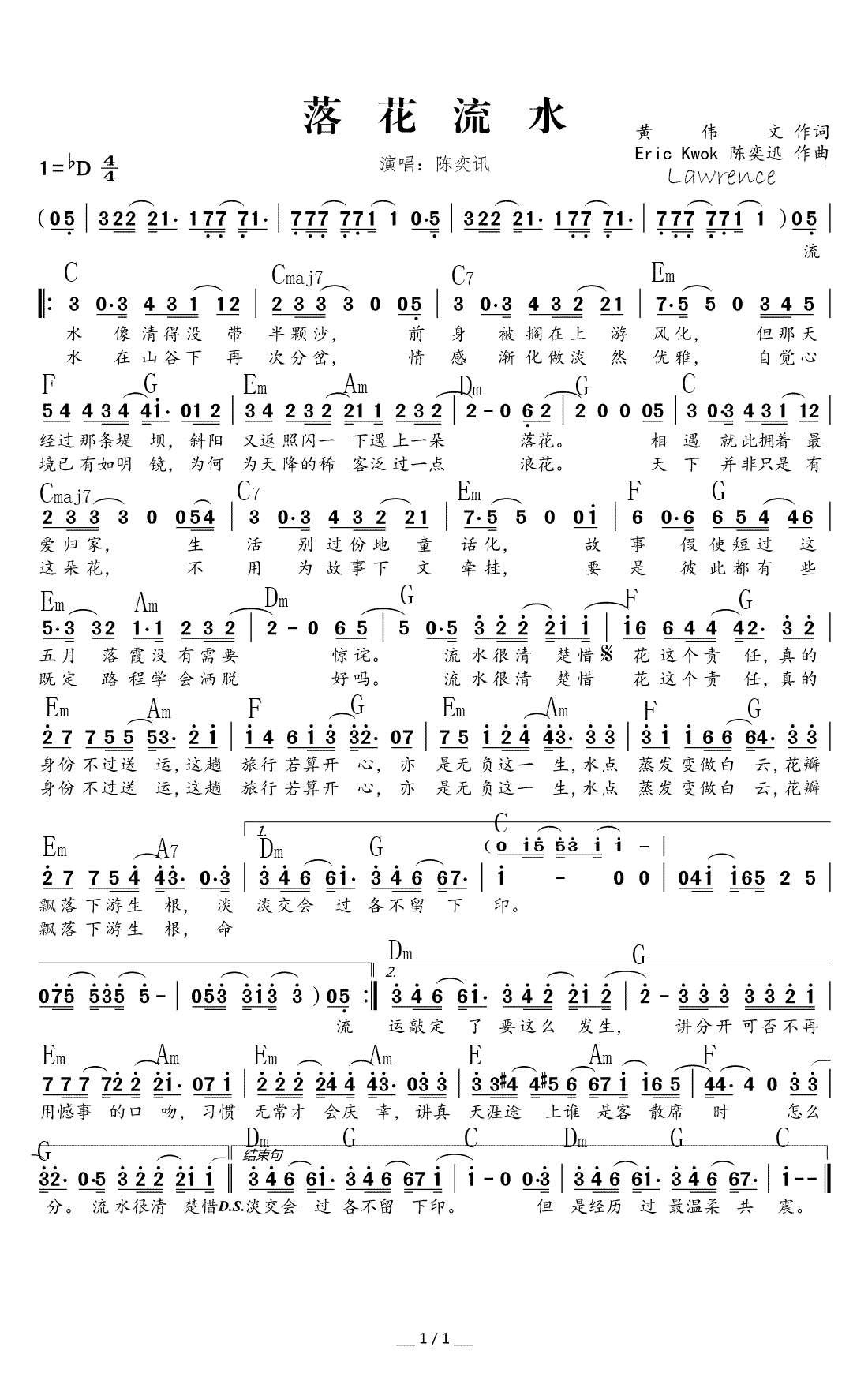 落花流水吉他谱,陈奕迅演唱一首经典粤语歌曲,和弦编配高清图片谱。Eason的声线好适合这种闻者心碎的苦情歌,由黄伟文作词,EricKwok(郭伟亮)作曲,“流水很清楚惜花这个责任,真的身份不过送运,这趟旅行若算开心,亦是无负这一生。”...