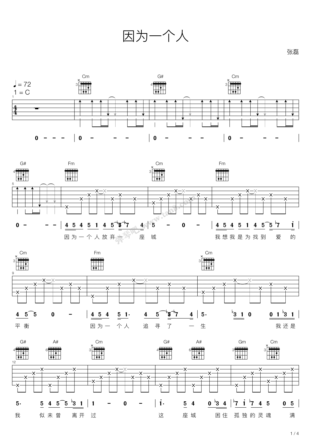 吉他张磊《因为一个人》吉他谱_吉他弹唱谱_弹琴吧编配