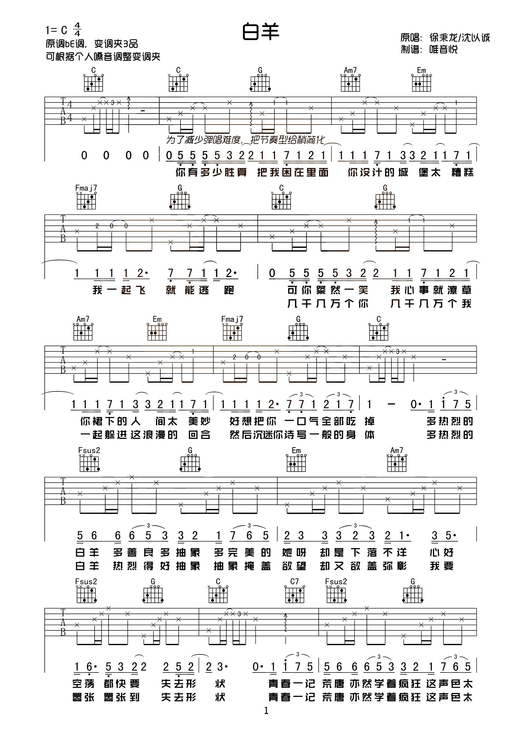 徐秉龙沈以诚《白羊》吉他谱,原调降E,变调夹夹三品,可根据个人嗓音调整变调夹,选用C调指法简化版。如果大家喜欢原版的泛音的感觉那么可以看看谱子第二页最下面,有详细说明,根据这个谱子演奏即可~...
