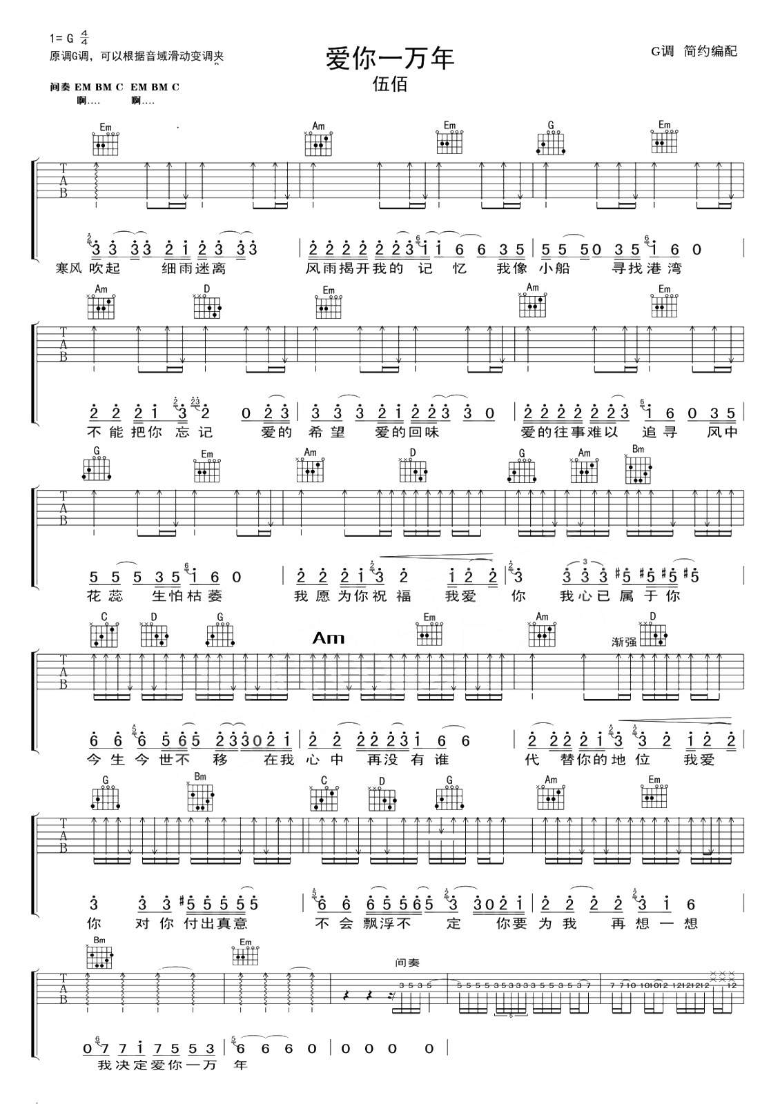 伍佰《爱你一万年》吉他谱,共有1张高清图谱,免翻页排版设计。...