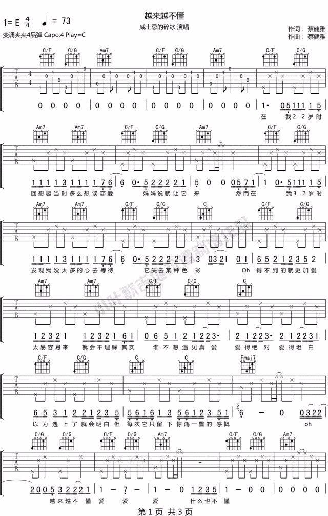 沈以诚《越来越不懂》吉他弹唱谱,共有3张高清图谱。...