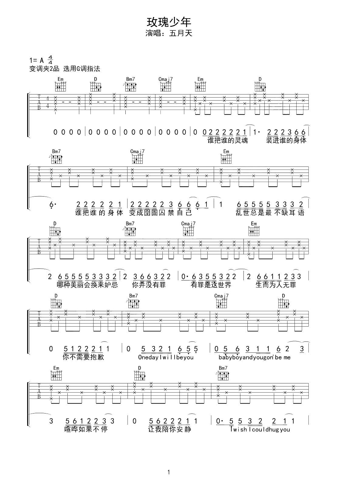吉他五月天《玫瑰少年》吉他谱_吉他弹唱谱_无限延音编配