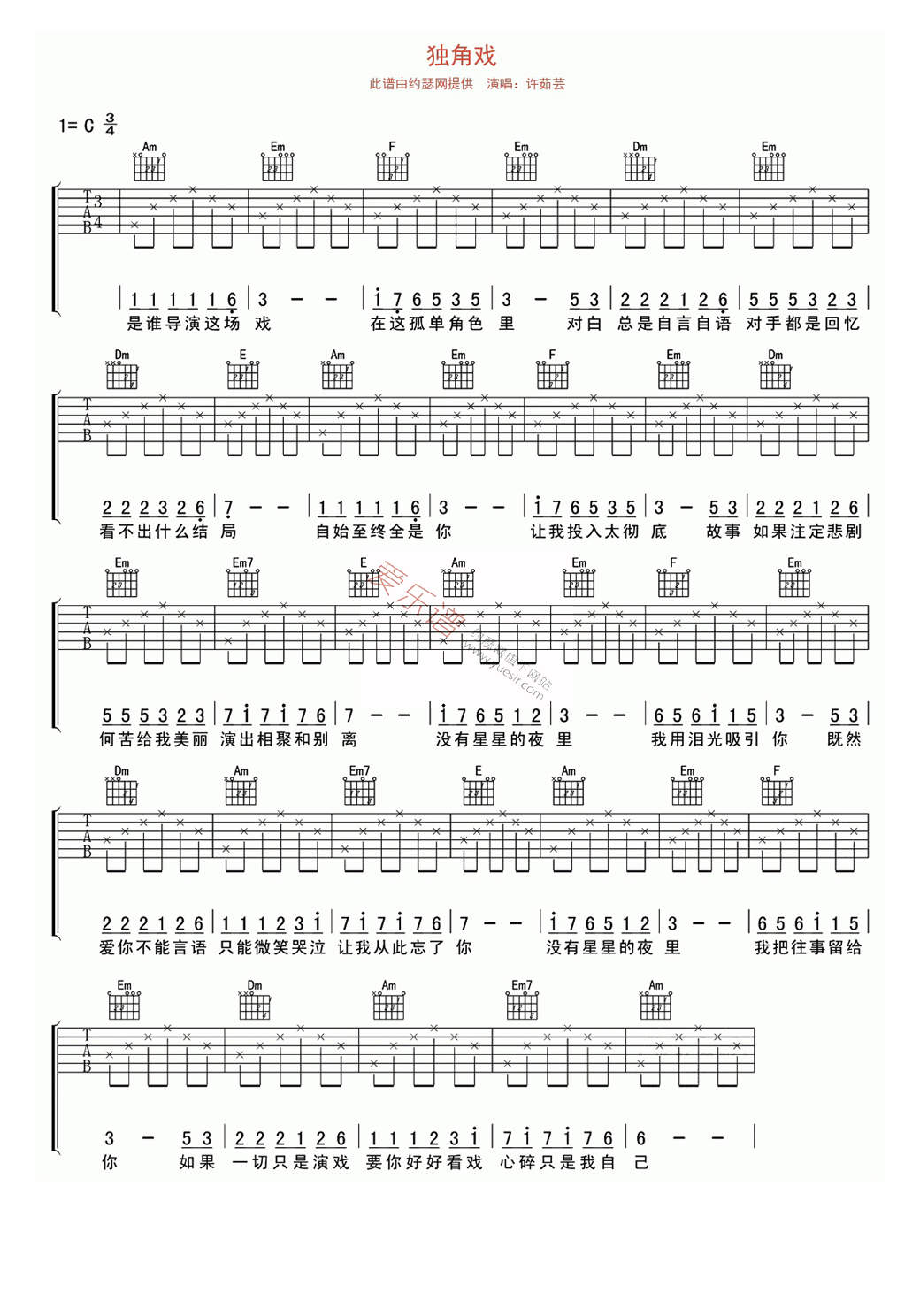 吉他许茹芸《独角戏》吉他谱_吉他弹唱谱