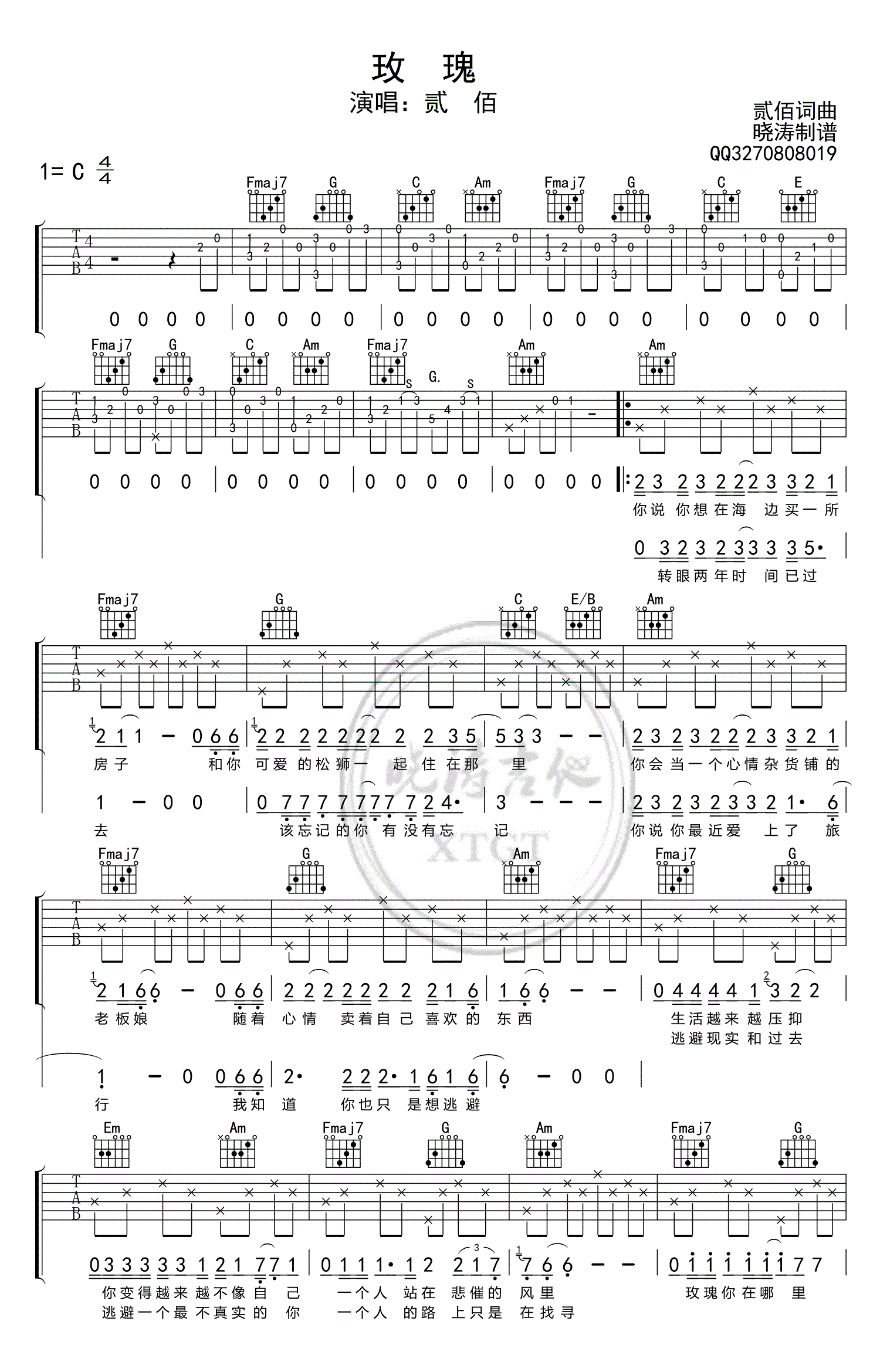 吉他贰佰《玫瑰》吉他谱_吉他弹唱谱_晓涛吉他编配