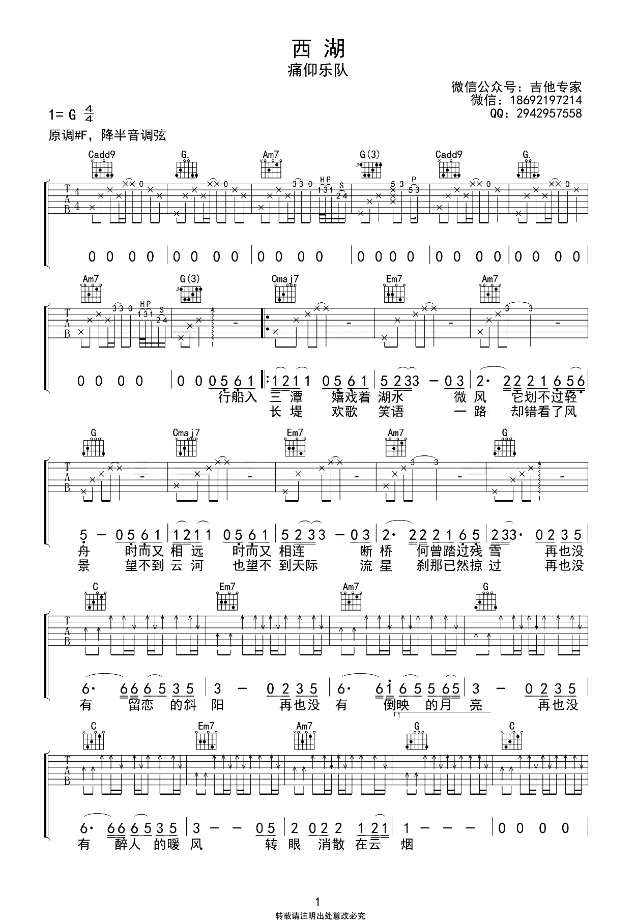 吉他痛仰乐队《西湖》吉他谱_吉他弹唱谱