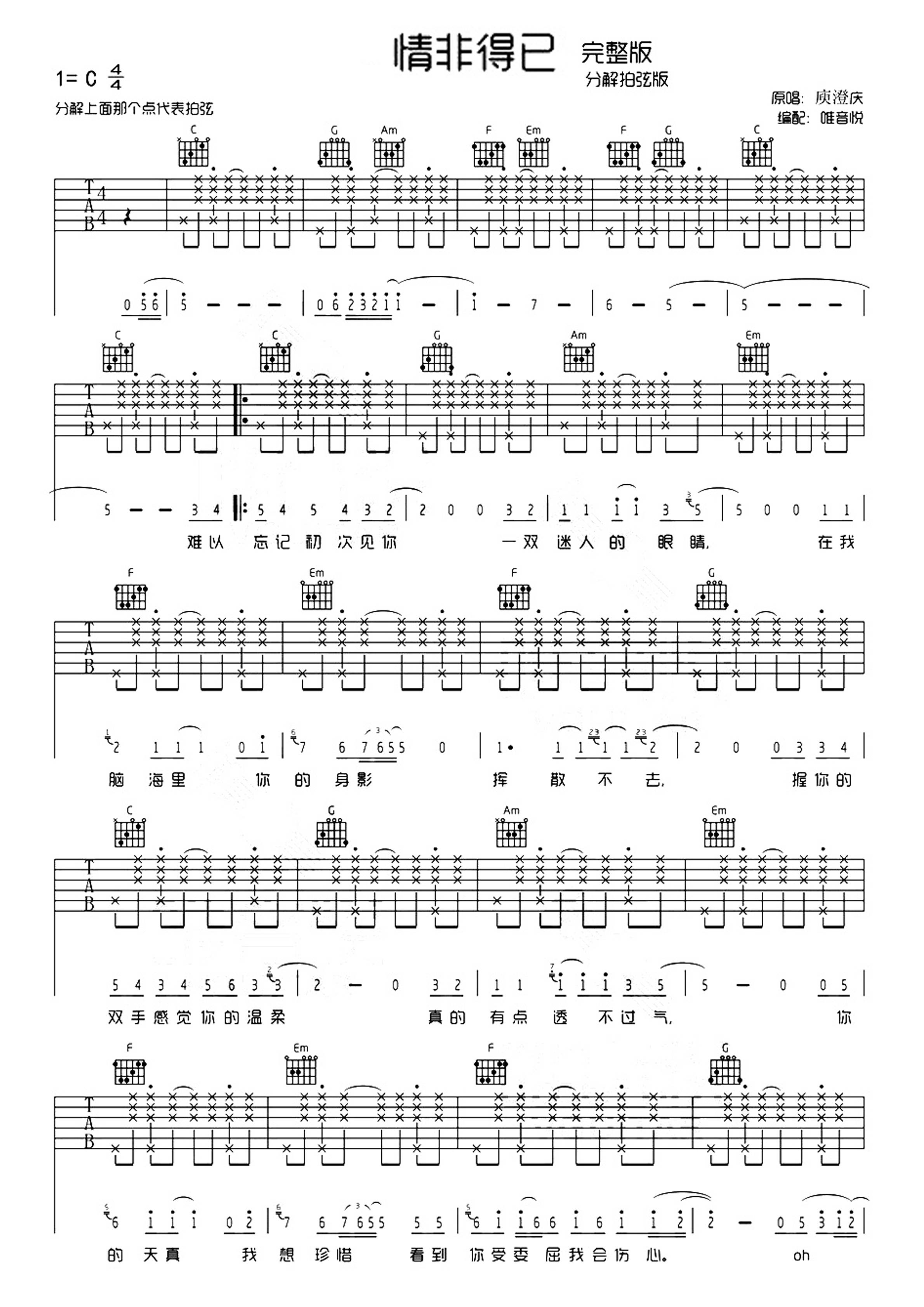 庾澄庆情非得已吉他谱拍弦版,C调指法,情非得已分解拍弦编配完整版,分解上面那个点代表拍弦,本曲谱根据原版编配,歌曲前奏、间奏和结束给编配好了,还有中间的solo。...