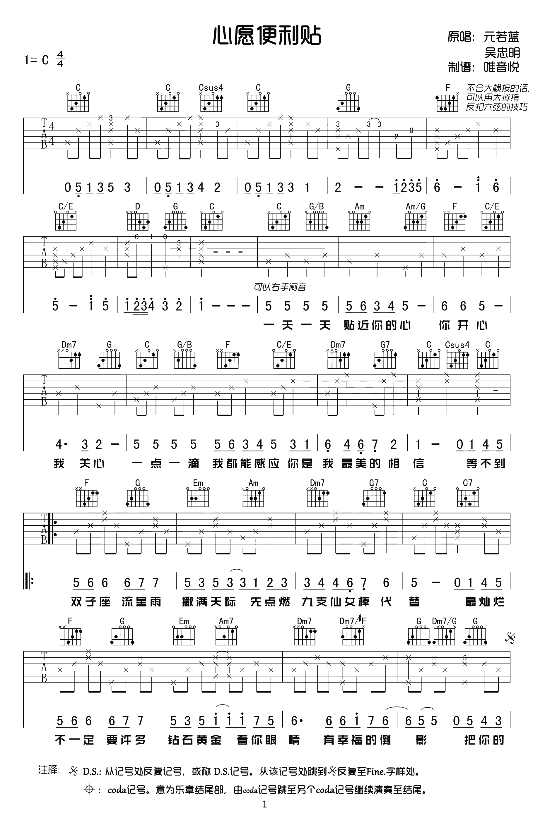 心愿便利贴吉他谱,台湾电视剧《命中注定我爱你》的片尾曲,吴忠明元若蓝演唱,《心愿便利贴》六线谱,原版C调简单吉他谱。大家只要把走向给记住了,整首歌其实谱子也就记住啦。总共也就分成3段,主歌:C->G/B/->Am->Am/G->F->C/E->Dm7->G;C->G/B/->F-...