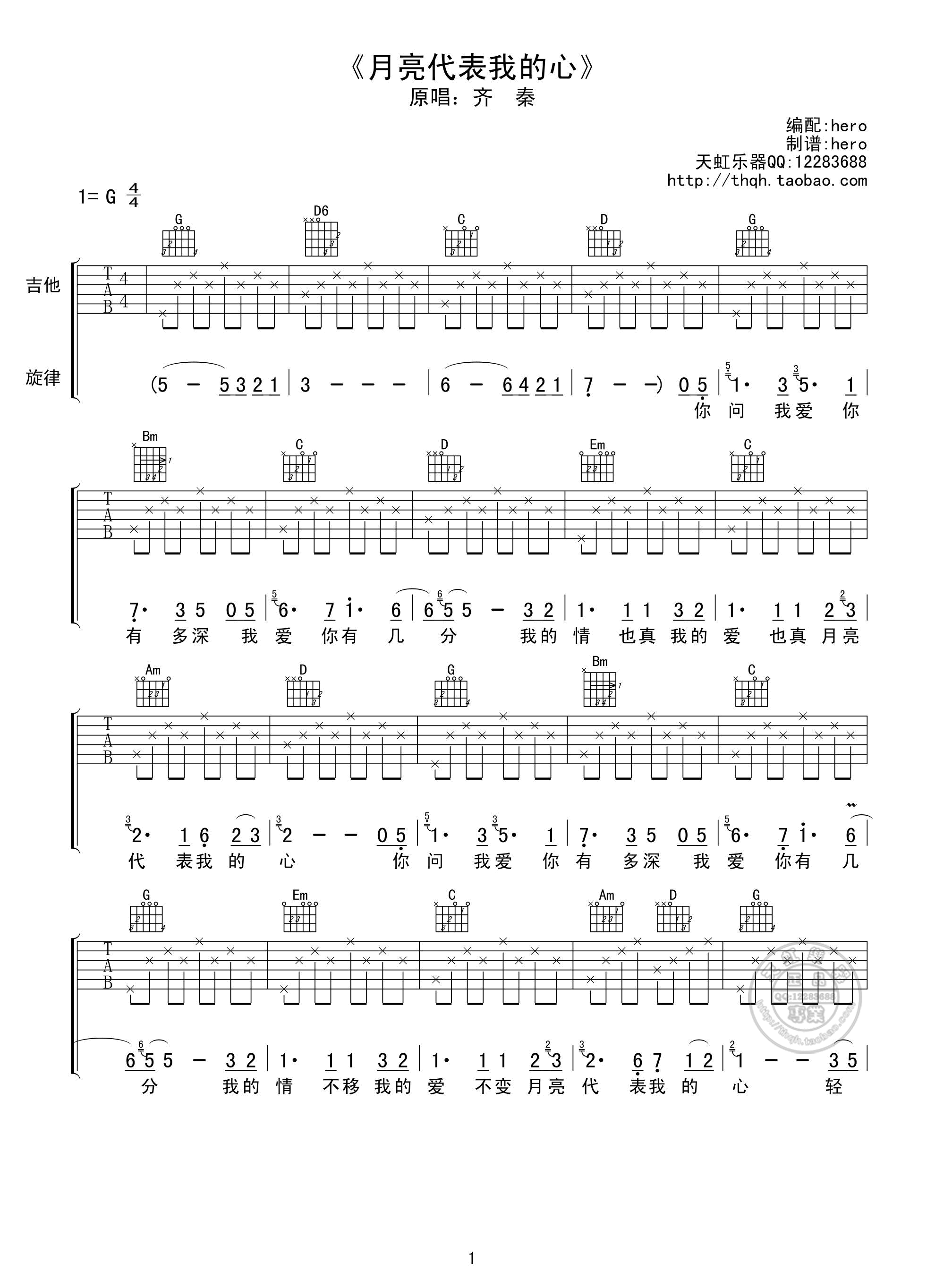 吉他齐秦《月亮代表我的心》吉他谱_吉他弹唱谱_天虹乐器--hero编配