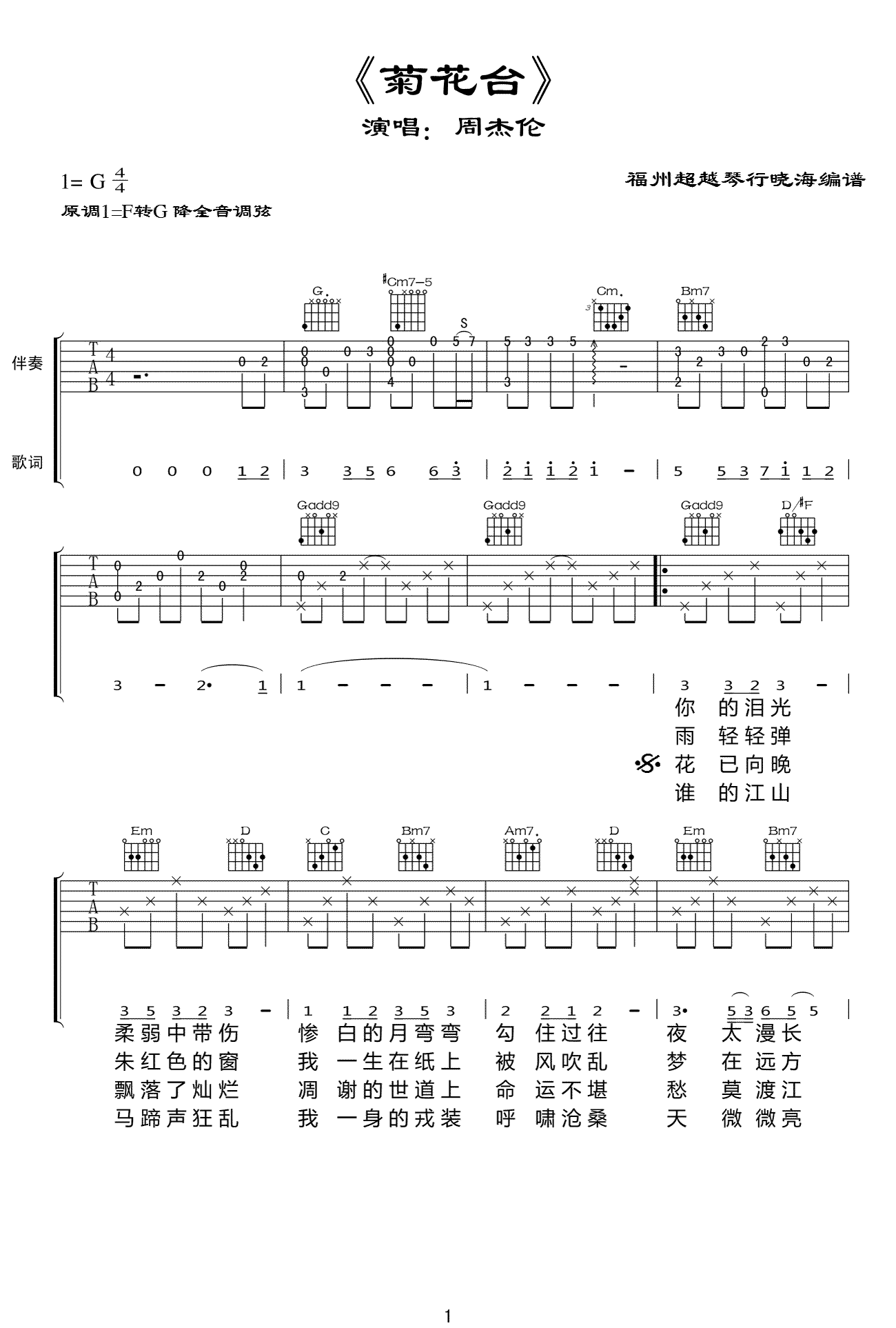吉他周杰伦《菊花台》吉他谱_吉他弹唱谱_晓海编配