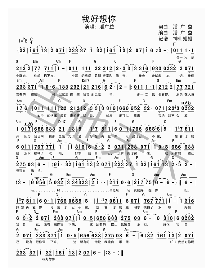 吉他潘广益《我好想你》吉他谱_吉他弹唱谱_神仙姐姐编配