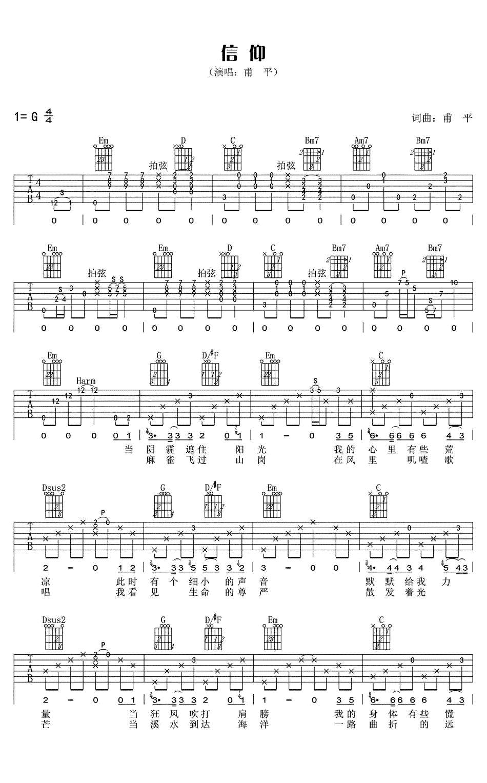 吉他甫平《信仰》吉他谱_吉他弹唱谱_新辉吉他编配