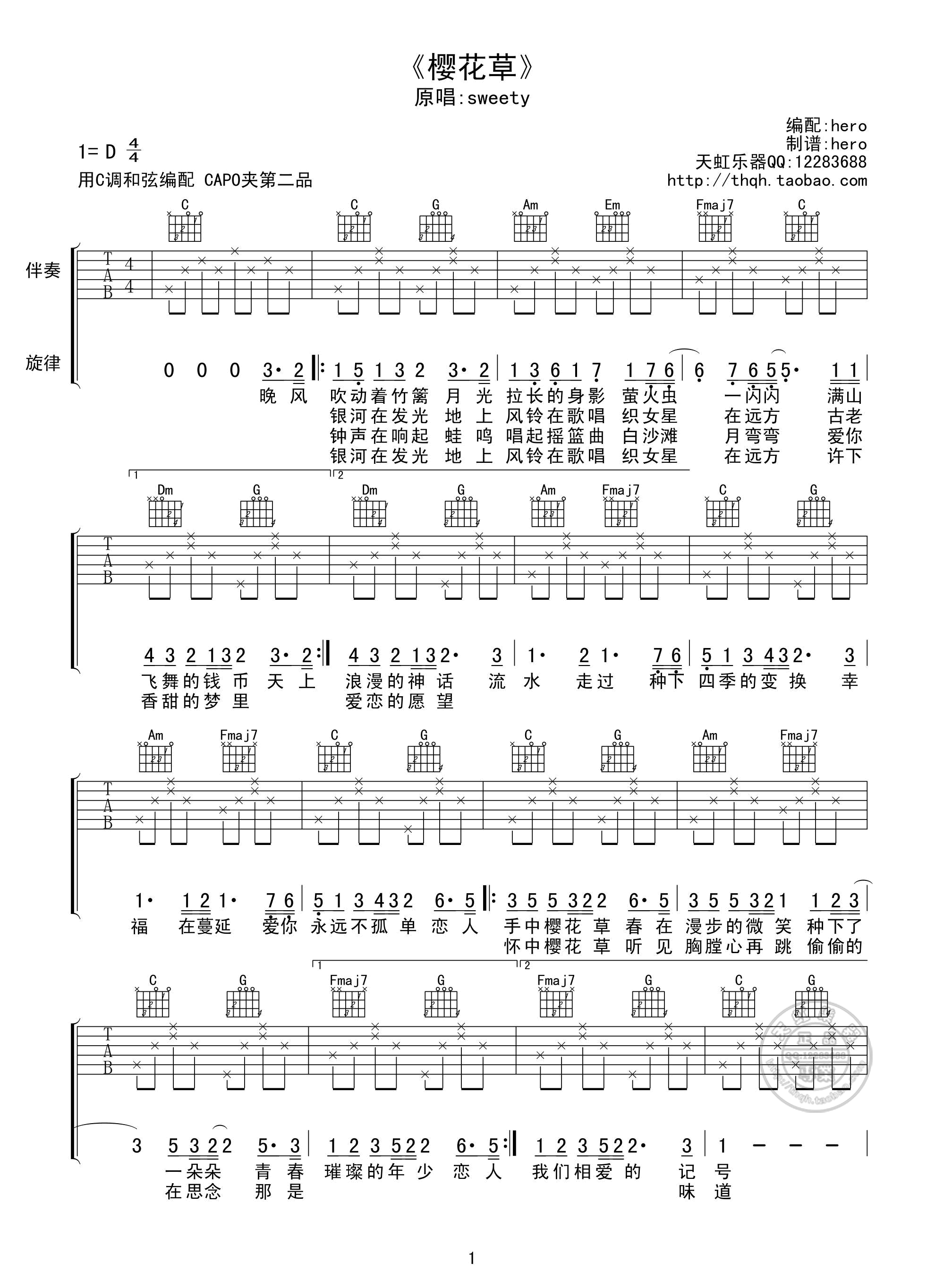 吉他Sweety《樱花草》吉他谱_吉他弹唱谱_天虹乐器--hero编配