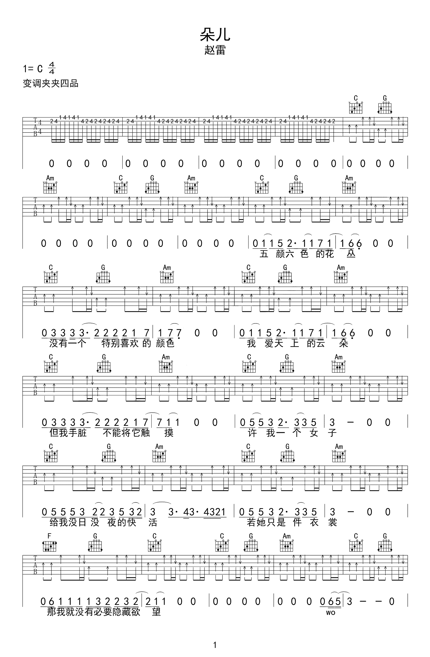 赵雷朵儿吉他谱,C调指法,变调夹夹四品,歌曲唱给像朵儿一样纯洁的姑娘。雷子的歌总是让人听上去很舒服,这首歌更是让人心情愉悦。长大后的我们,终归是不再纯粹,人生路上遇到的五颜六色,也许是希望,也许是欲望,也许是失望,愿如头顶之月,不被世事纷扰所改变初心。...