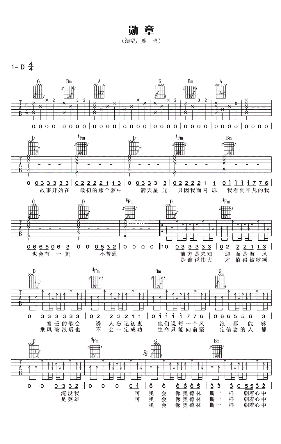 吉他鹿晗《勋章》吉他谱_吉他弹唱谱_新辉吉他编配