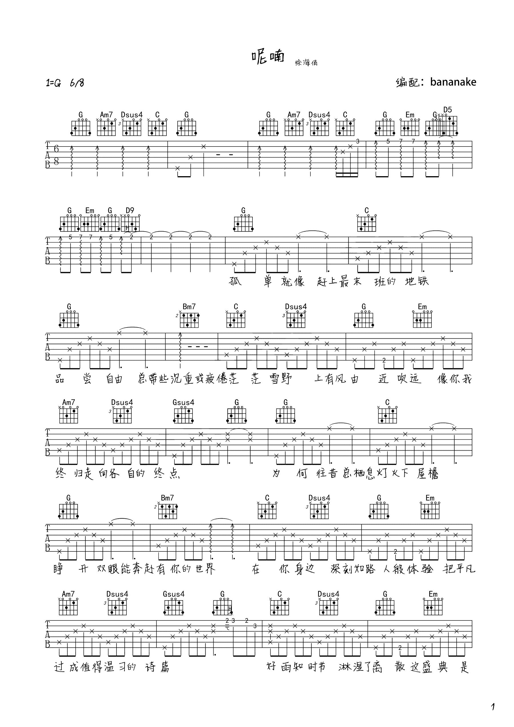 吉他徐海俏《呢喃》吉他谱_吉他弹唱谱_Bananake编配