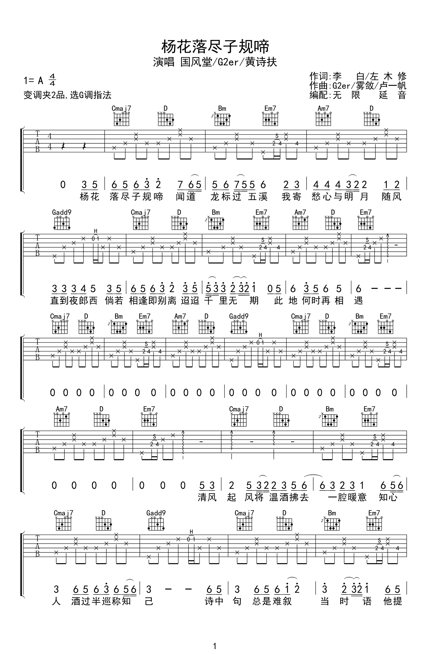 杨花落尽子规啼吉他谱_G调_黄诗扶_弹唱六线谱调A,变调夹2品,选用G调指法,三张图片谱例。...