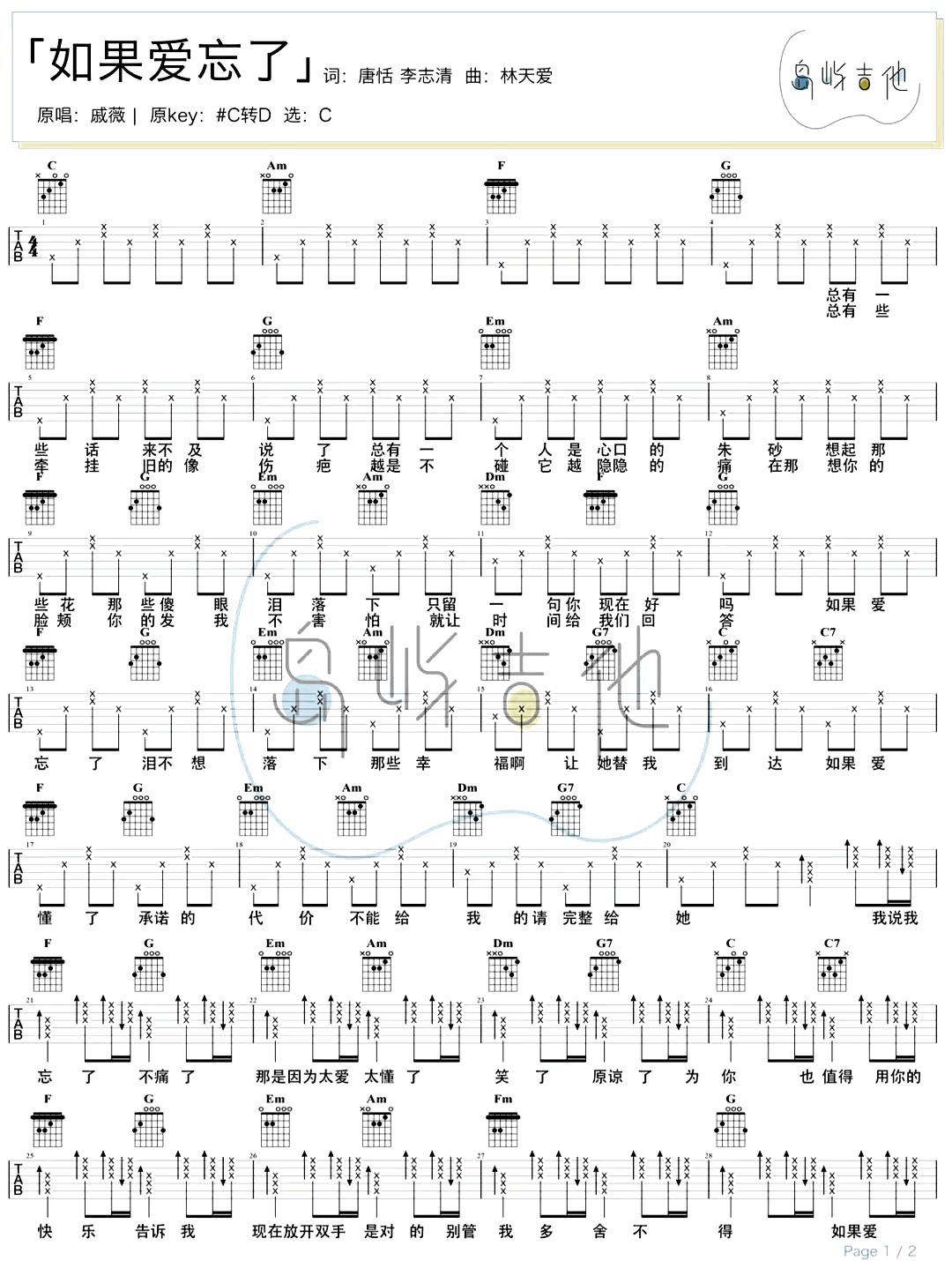 如果爱忘了吉他谱_戚薇_C调弹唱谱_《爱情睡醒了》片尾曲选用C调指法编配,两张图片六线谱。...