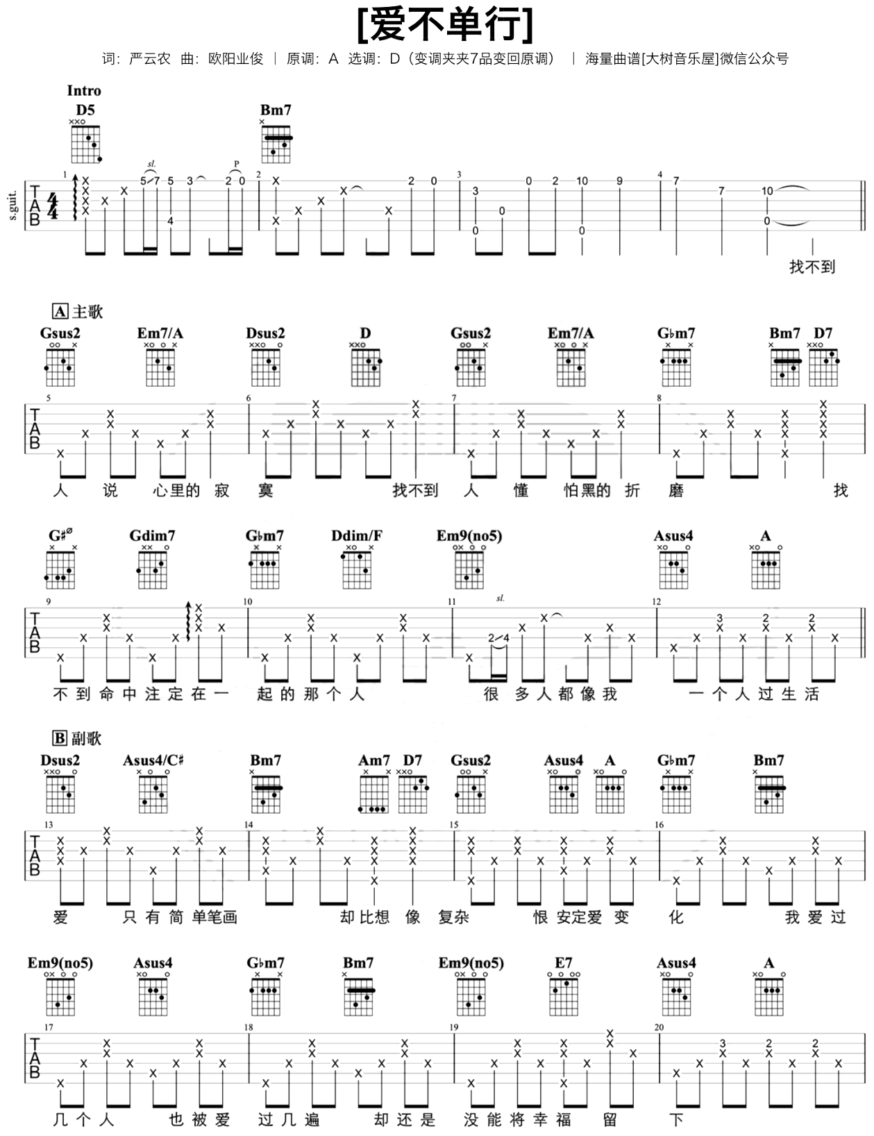 爱不单行吉他谱_D调_罗志祥曲谱选用了D调指法编配,如果想要弹(A调)原调,可以把变调夹夹第七品,琴友们也可以根据自己音域调整变调夹位置。...